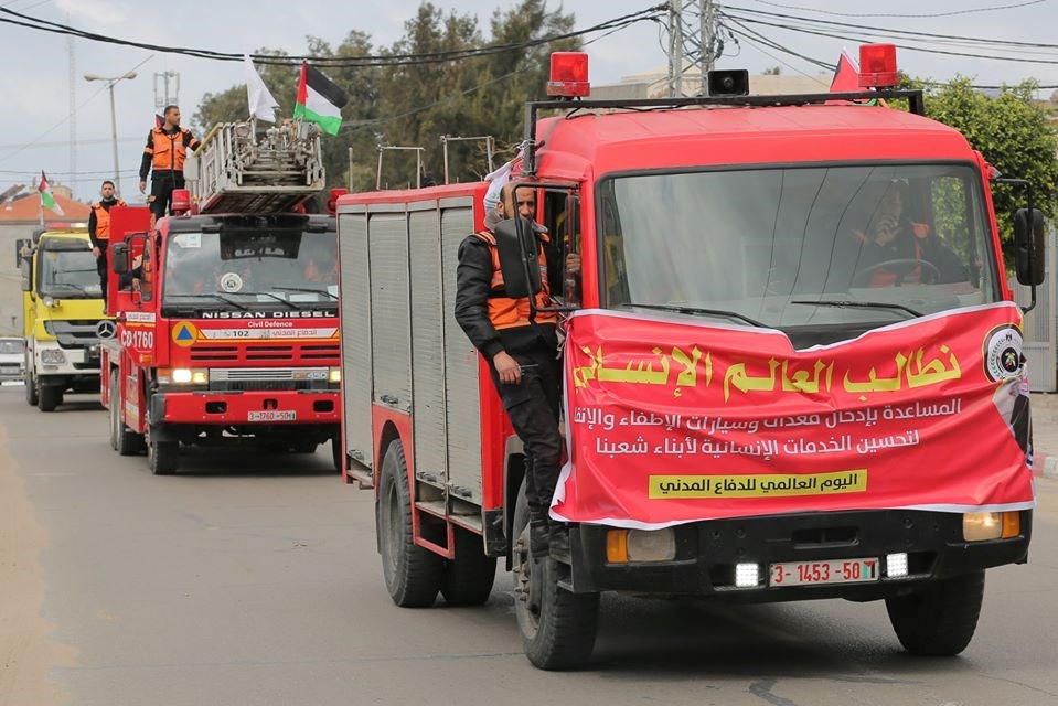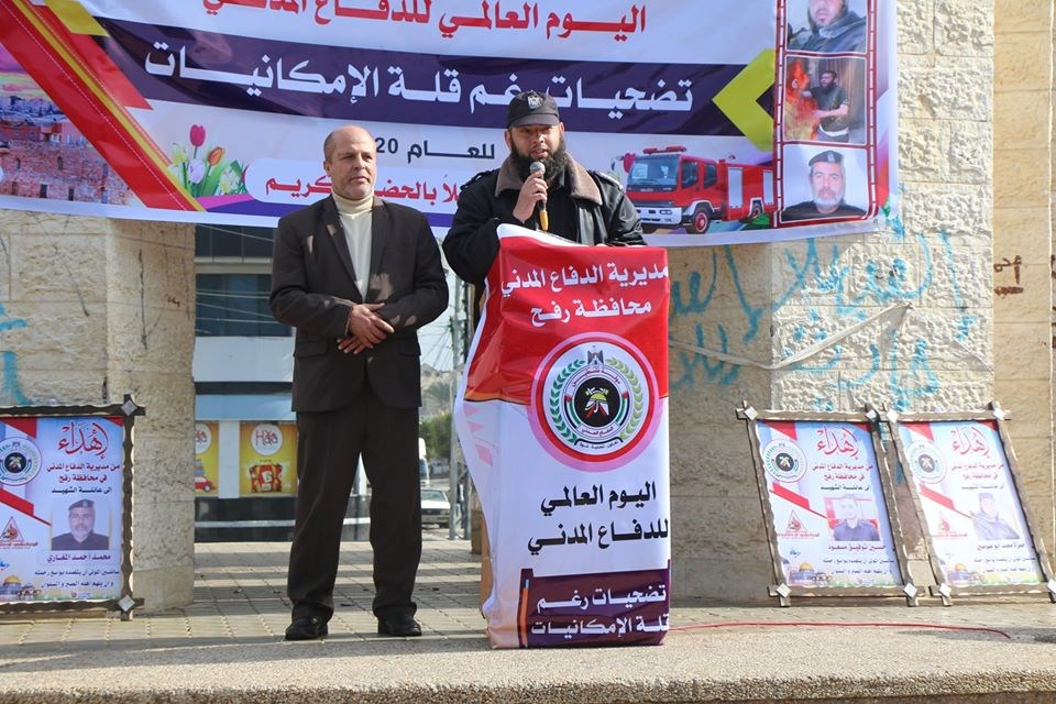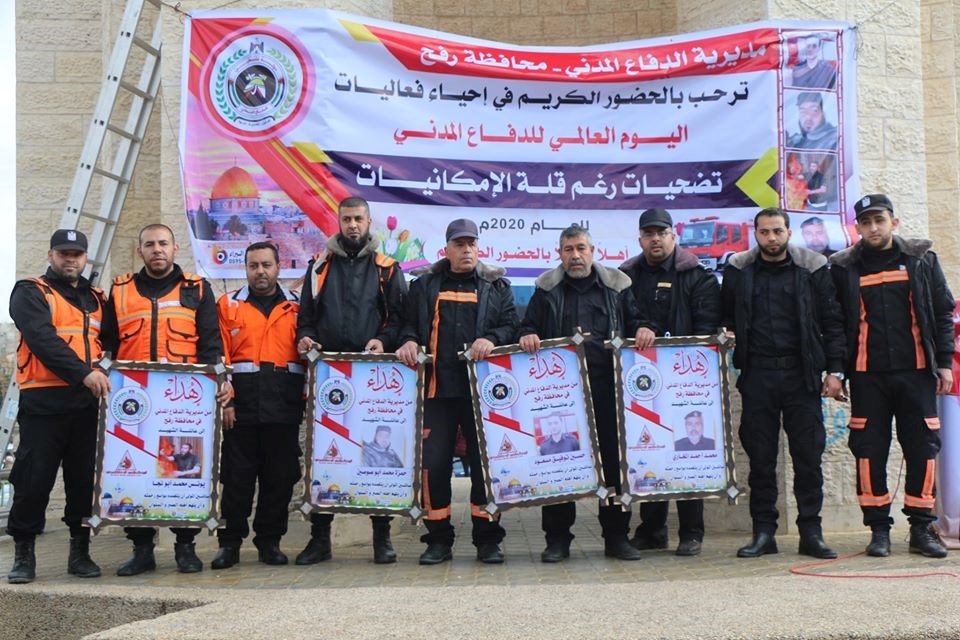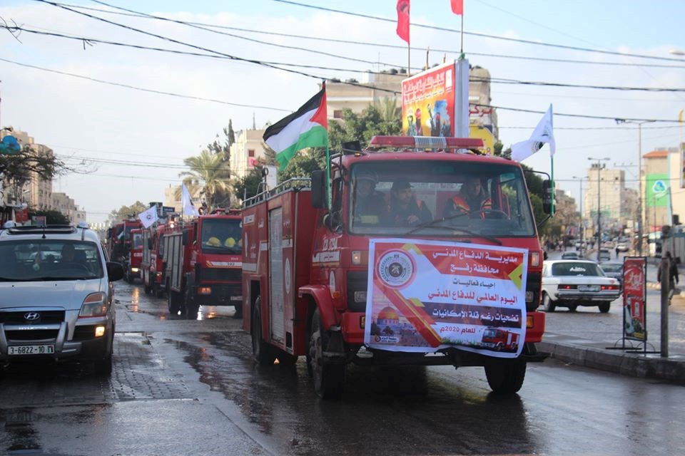 في سياق متصل، نظم جهاز الدفاع المدني بمحافظة رفح مسيراً محمولاً ووقفة وسط المدينة بمناسبة اليوم العالمي للدفاع المدني، بمشاركة طواقم وكوادر الجهاز.