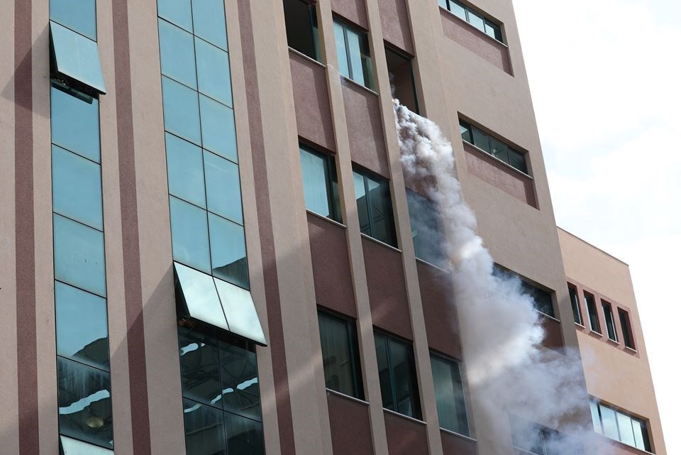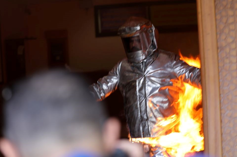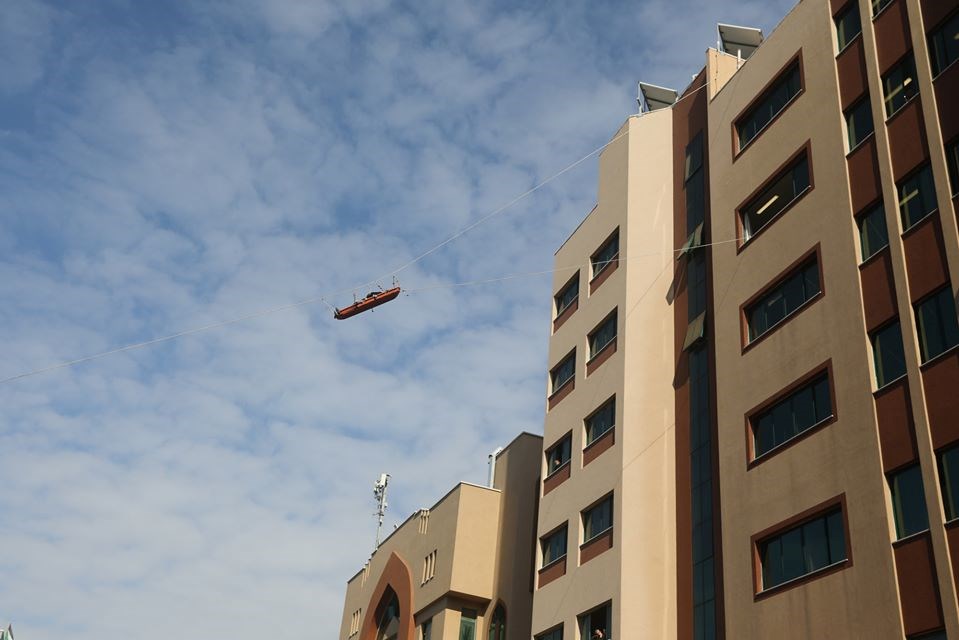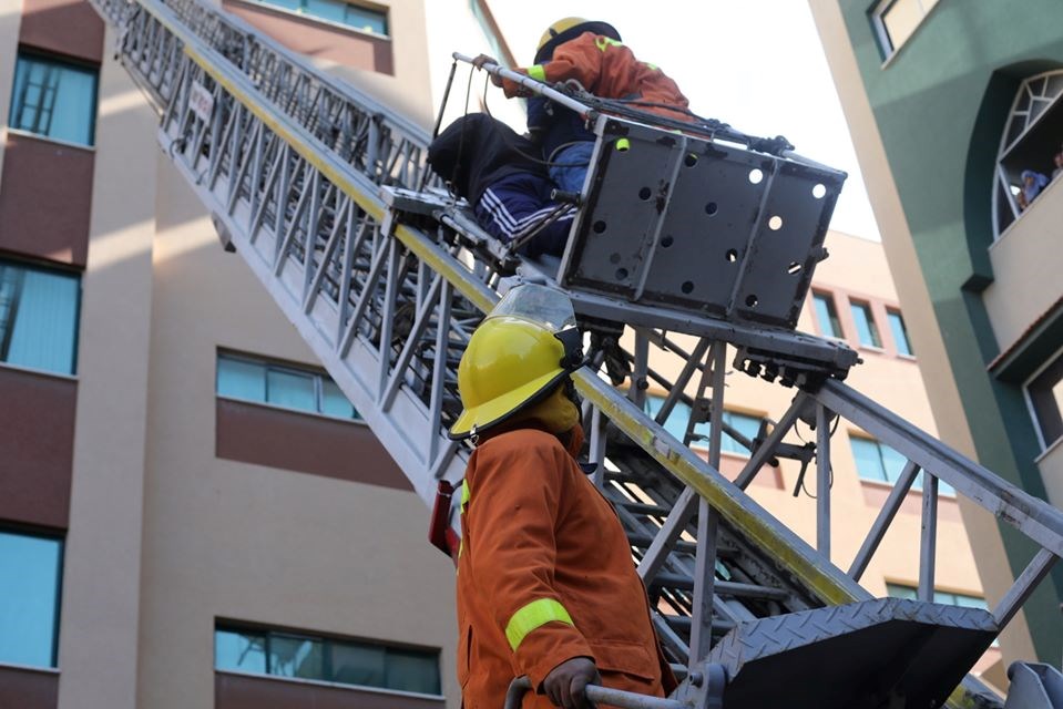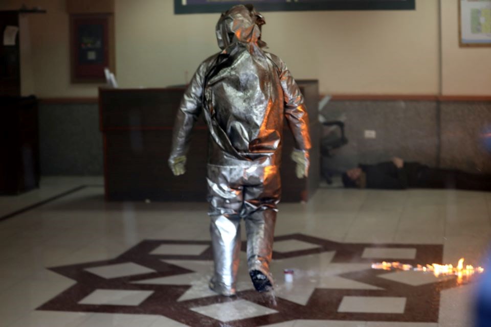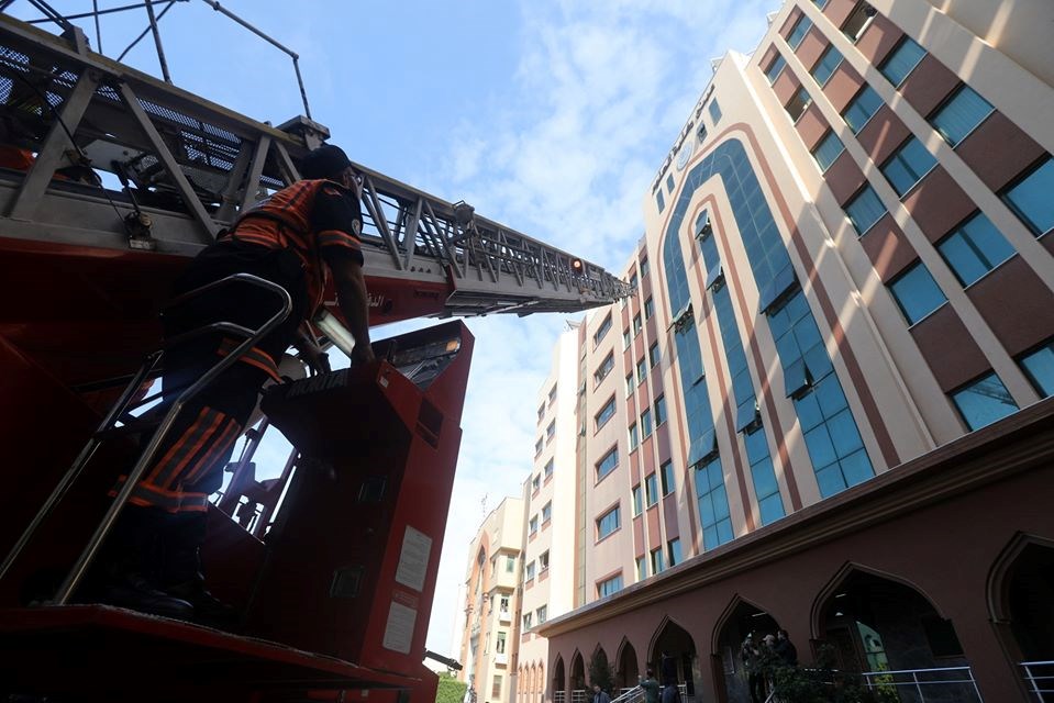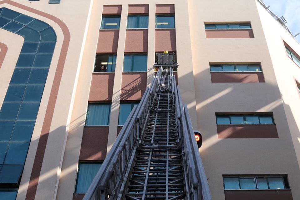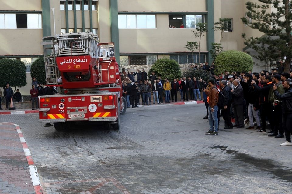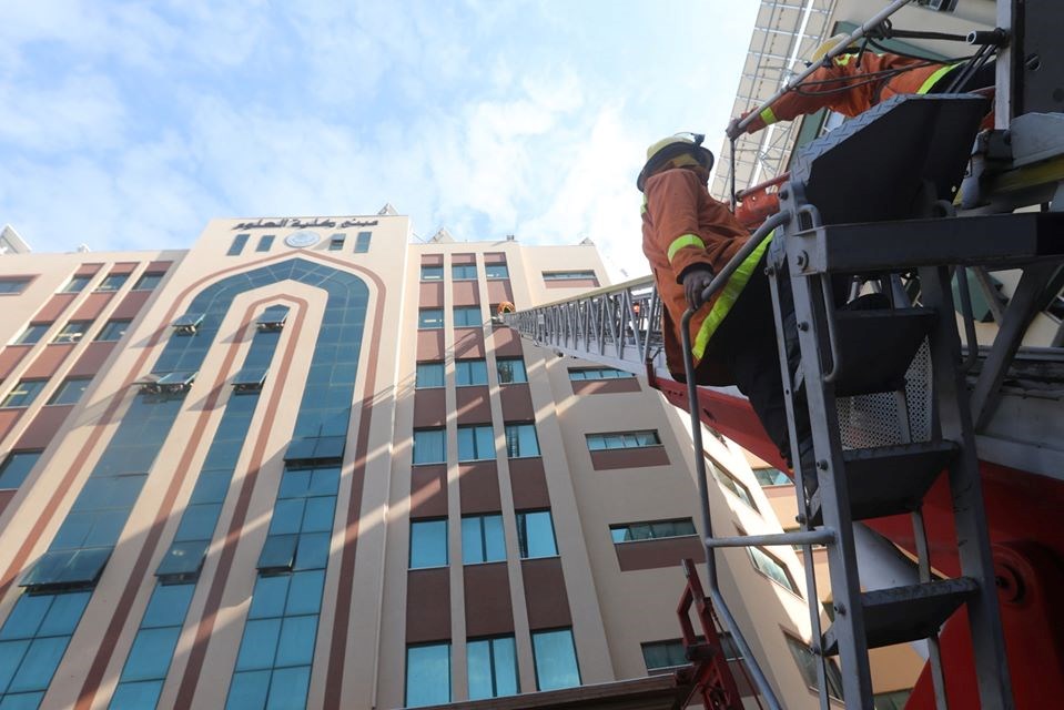 إخلاء لأحد مباني الجامعة في محاكاة لتعرضه لحدث كارثي.