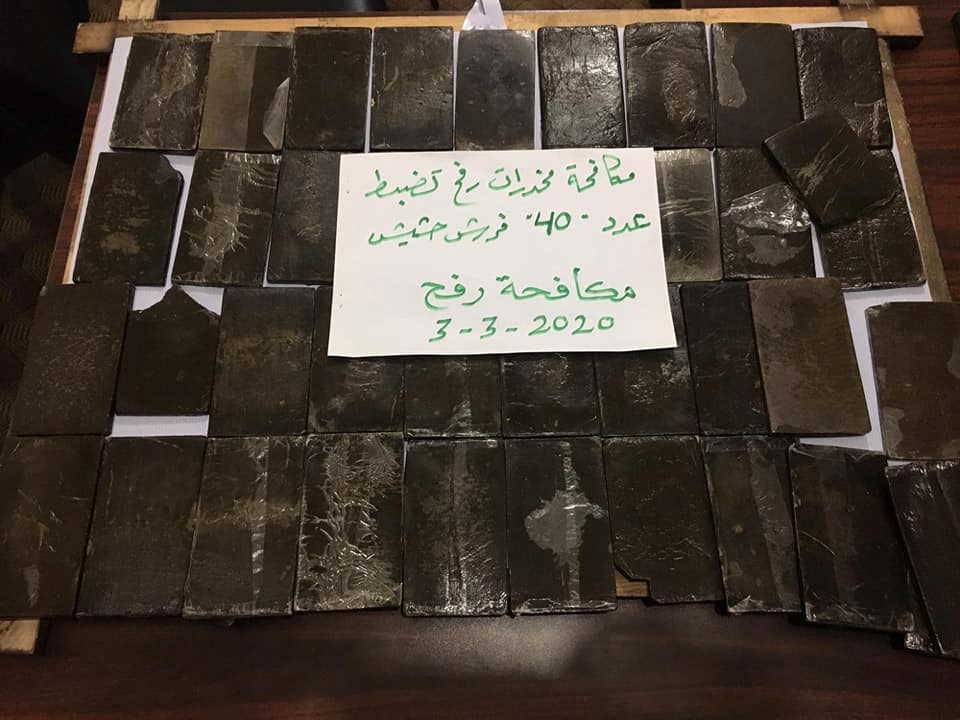 شرطة مكافحة المخدرات في محافظة رفح "40" فرش حشيش، وأوقفت اثنين من المروجين