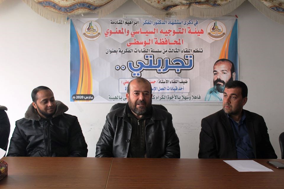 وفي سياق آخر، نظمت هيئة التوجيه السياسي والمعنوي بمحافظة الوسطى لقاءً فكرياً ، من ضمن سلسلة لقاءات فكرية تستهدف كادر مكتب الوسطى بحضور ضيف اللقاء الأستاذ حسن المقادمة أحد قيادات العمل الإسلامي، والذي تحدث بدوره عن الشهيد الدكتور إبراهيم المقادمة ودوره المؤثر في المجتمع واستشرافه للمستقبل.
