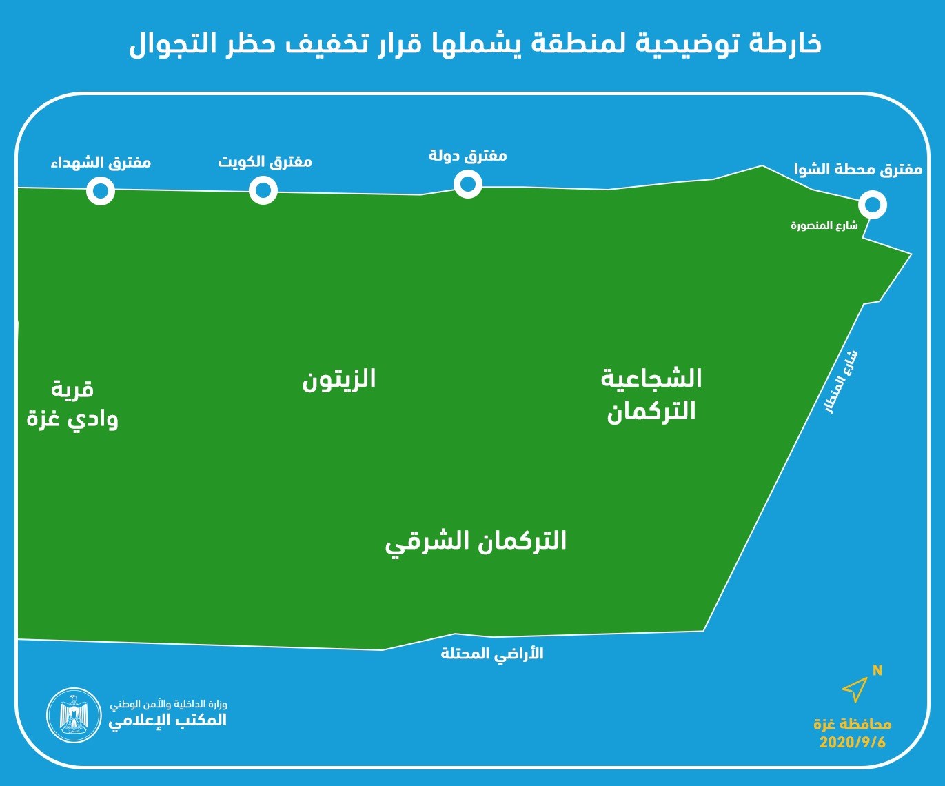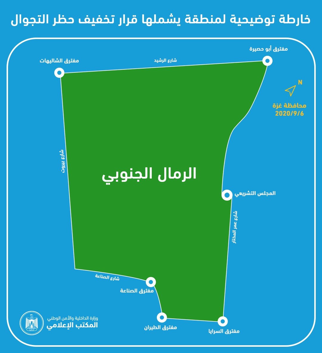 ثالثاً: تخفيف إجراءات حظر التجوال في أجزاء من منطقة جنوب غرب مدينة غزة، في المربع الواقع من مفترق السرايا حتى مفترق أبو حصيرة غرباً، إلى مفترق الشاليهات جنوباً إلى مفترق الصناعة، مروراً بشارع بيروت حتى مفترق الطيران شرقاً. (كما هو موضح في الخارطة المرفقة)