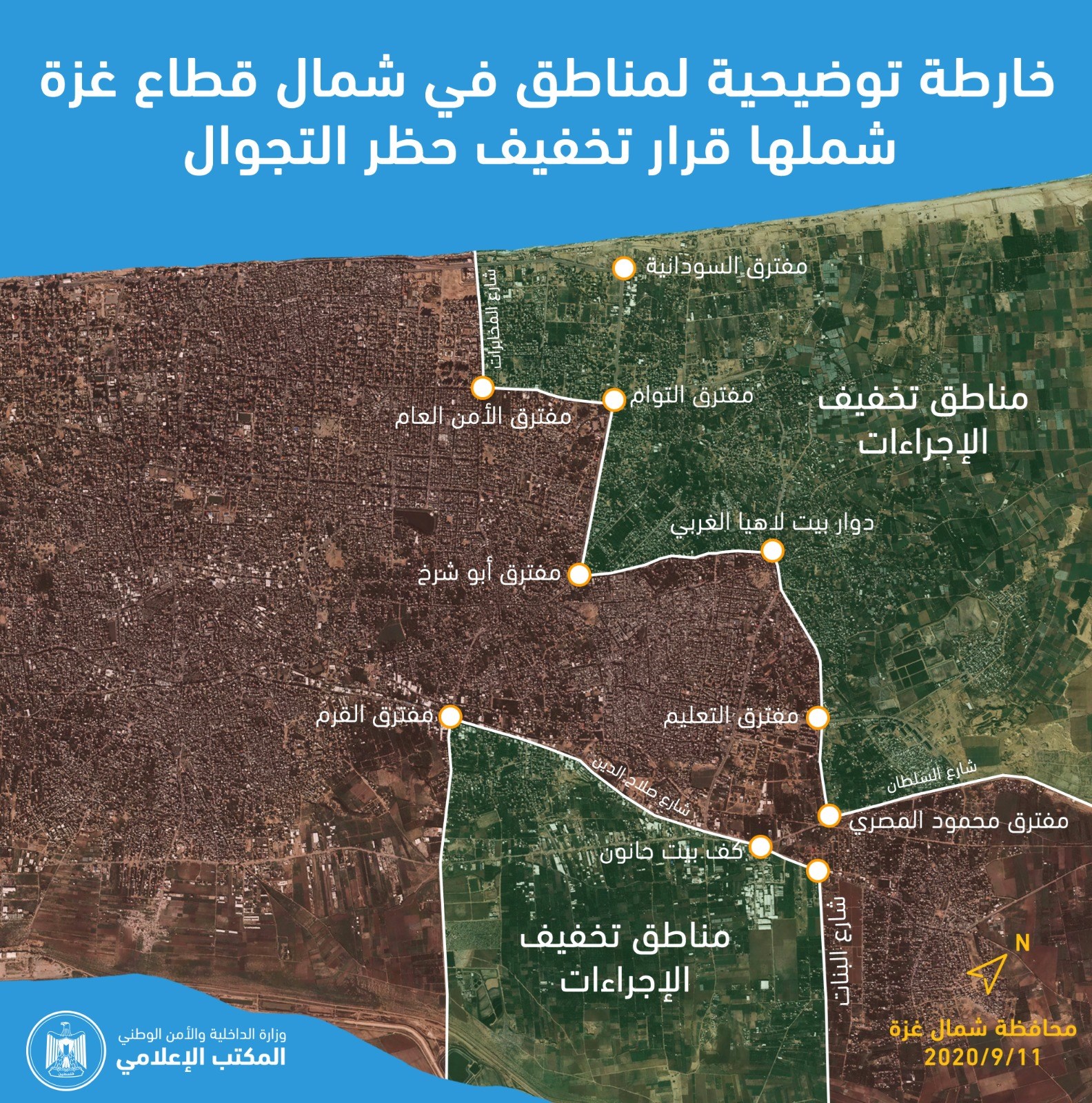 بناء على التقييم المستمر للحالة الوبائية في قطاع غزة، قررت وزارة الداخلية والأمن الوطني تخفيف إجراءات حظر التجوال في عدد من مناطق محافظة شمال غزة، وفق ما هو موضح على الخارطة المرفقة، وهي كالآتي: