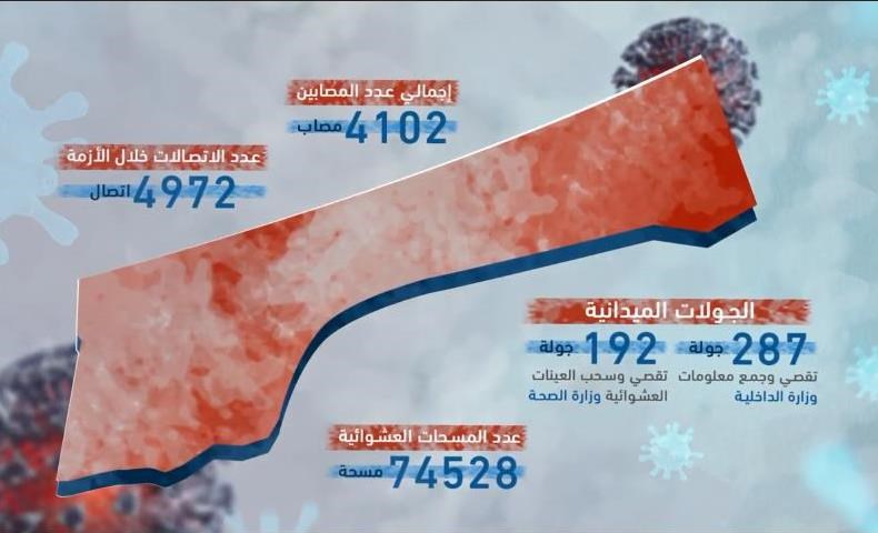 كما أجرت فرق التقصي في كلّ من وزارتي الداخلية والصحة 479 جولة ميدانية في كافة محافظات القطاع، وأخذت مسحات عشوائية من 74 ألف و520 مواطناً.