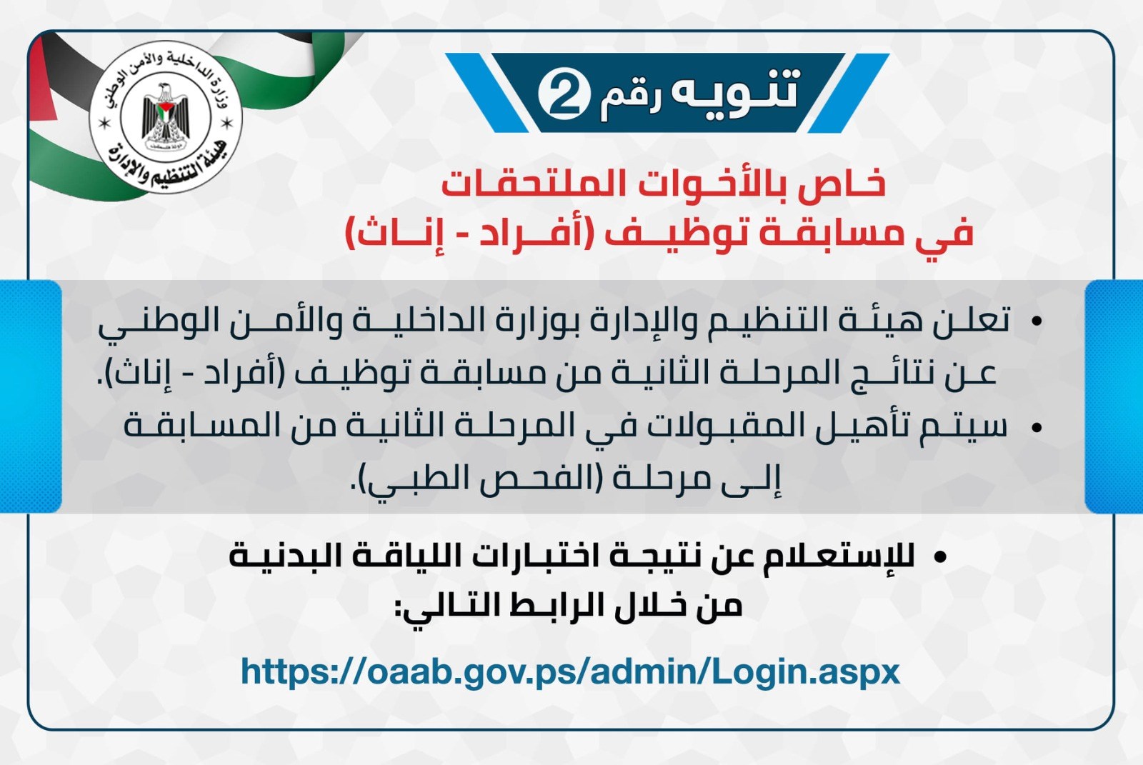 وكانت هيئة التنظيم والإدارة بوزارة الداخلية والأمن الوطني، أعلنت في 29 نوفمبر/ تشرين الثاني 2020، عن فتح باب التسجيل لمسابقة تعيين أفراد - إناث للعمل في قوى الأمن الفلسطينية، ضمن خطة وزارة الداخلية؛ لرفع مستوى كفاءة الأجهزة الأمنية.