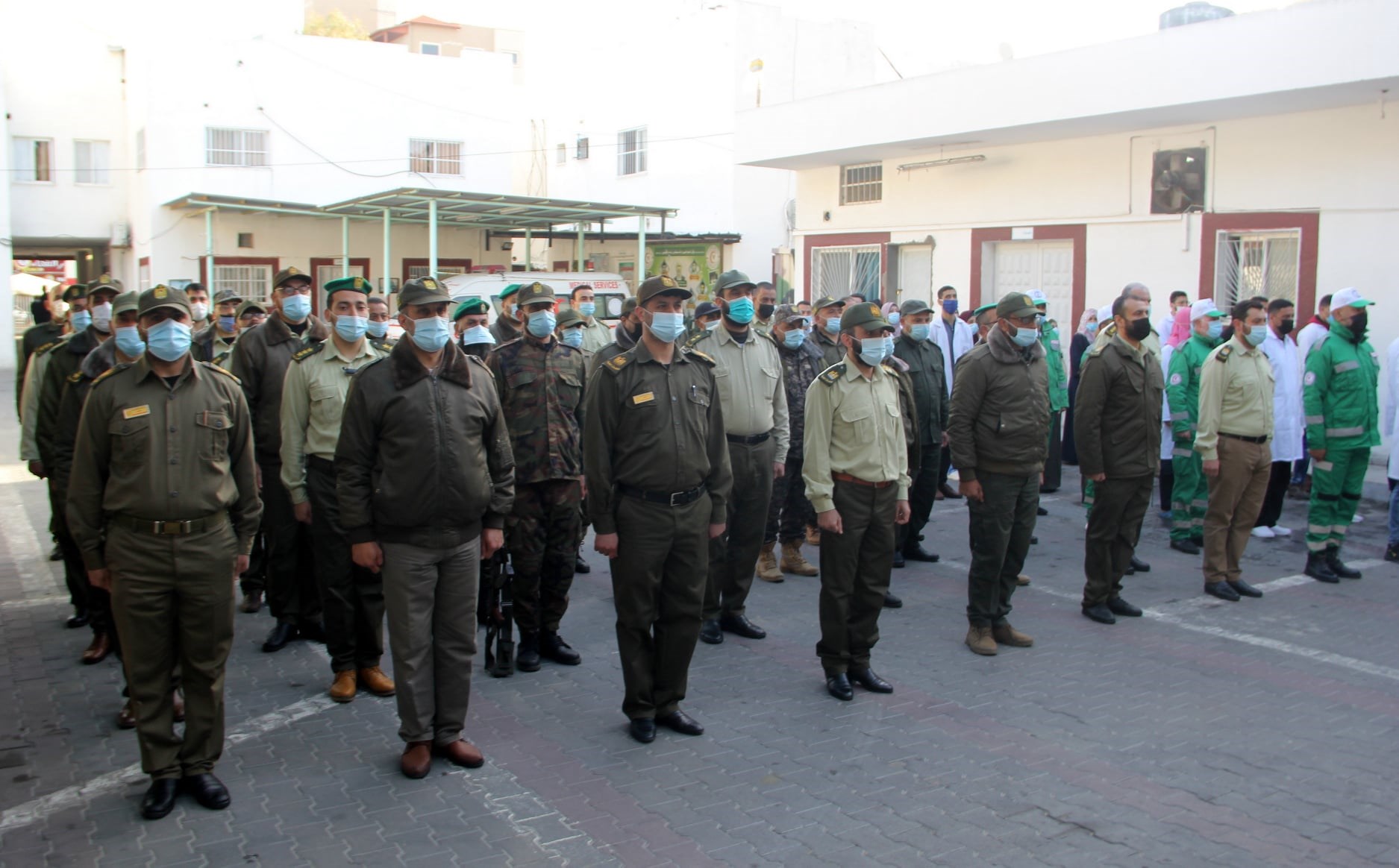 وحضر طابور الأركان مدير عام الخدمات الطبية العميد محمد صالح، ومساعديه العقيد محمد عوض، والعقيد محمد الشوار، والعقيد رياض أبو شمالة، والعقيد سميح أبو حبل، ومدير مجمع عدوان العقيد أحمد الكلوت إلى جانب الكوادر الطبية والإداريين العاملين بالمجمع.