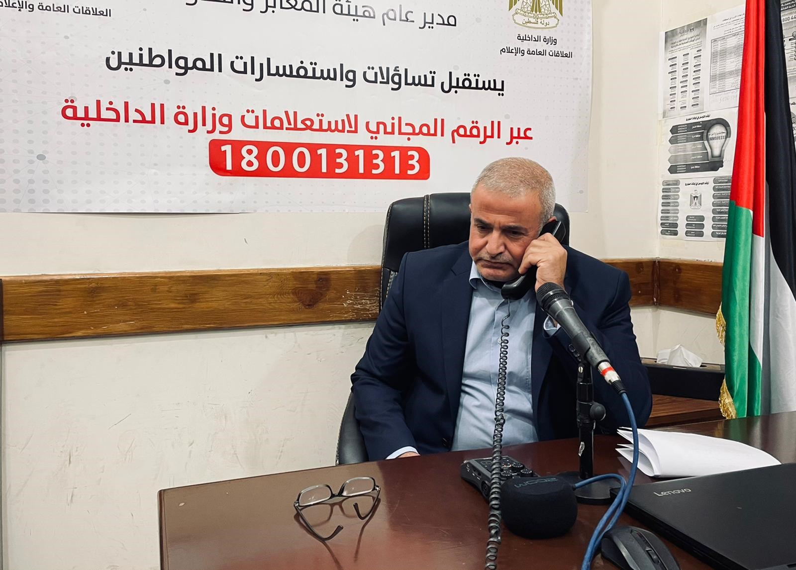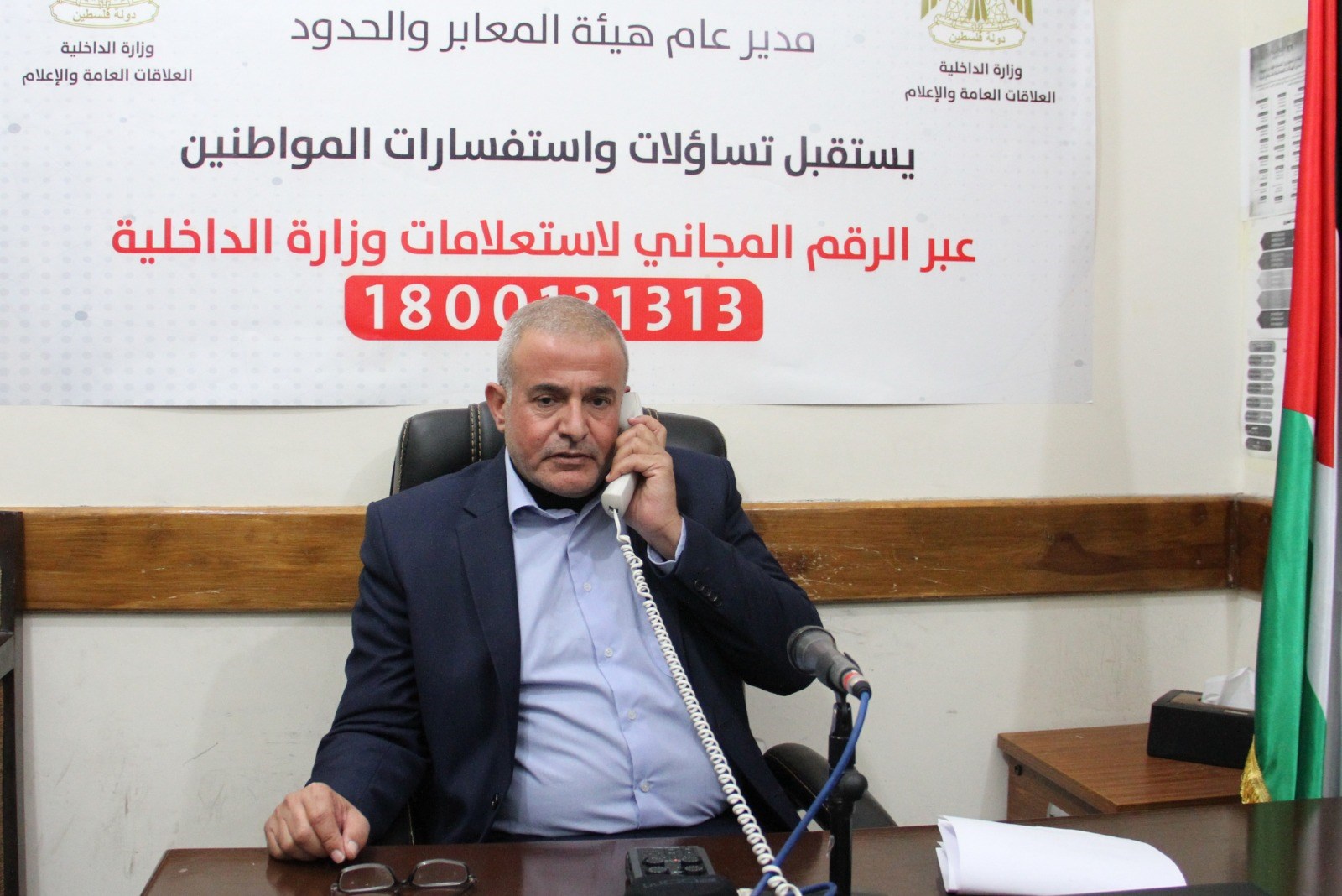 واستقبل العميد فؤاد أبو بطيحان مدير عام الهيئة، اتصالات المواطنين على الرقم المجاني لاستعلامات وزارة الداخلية، ما بين الساعة 10 صباحاً وحتى الساعة 12 ظهراً، مُجيباً على عشرات التساؤلات والاستفسارات المتعلقة بعمل المعابر في قطاع غزة، وآليات السفر والتنقل.