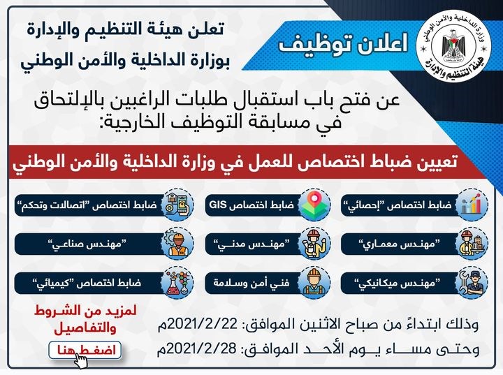 تعلن هيئة التنظيم والإدارة بوزارة الداخلية عن عقد مسابقة تعيين ضباط اختصاص (ذكور) للعمل في قوى الأمن الفلسطينية، وذلك اعتباراً من صباح يوم الإثنين 22 فبراير وحتى مساء يوم الأحد 28 فبراير 2021، وفقاً للتخصصات والشروط التالية: