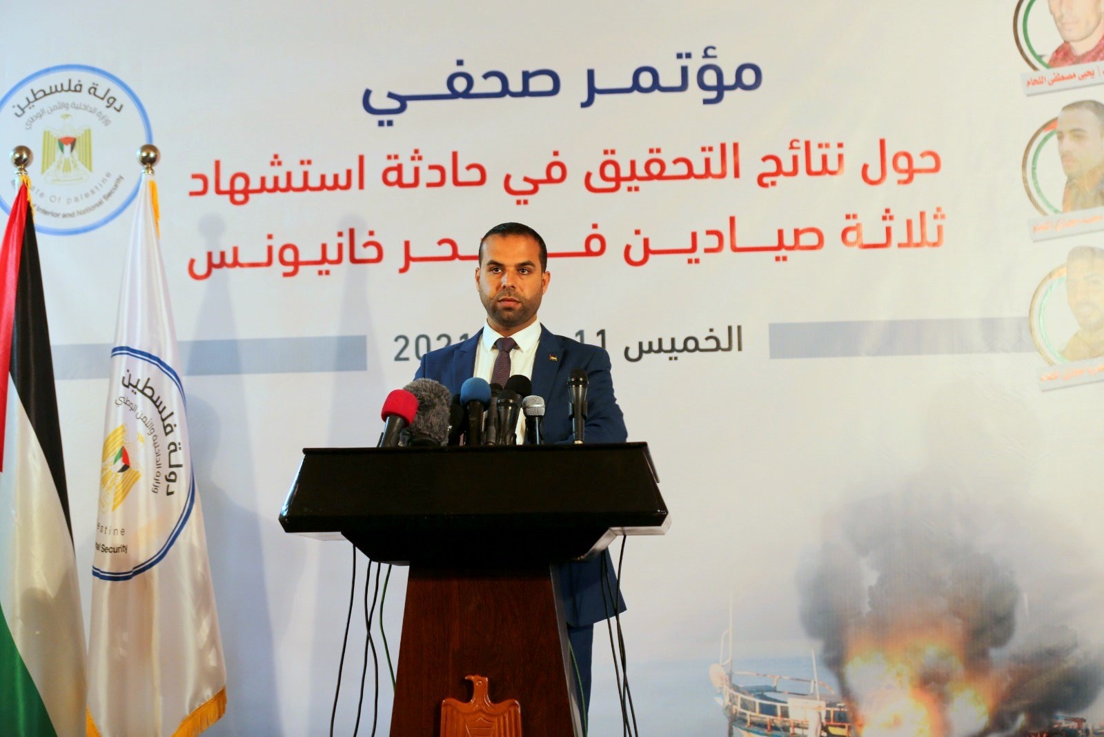 أعلنت وزارة الداخلية والأمن الوطني، الخميس، نتائج التحقيق بحادثة استشهاد الصيادين الثلاثة في عرض بحر خانيونس صباح الأحد الماضي 7 مارس 2021، وذلك خلال مؤتمر صحفي للمتحدث باسم الوزارة إياد البزم.