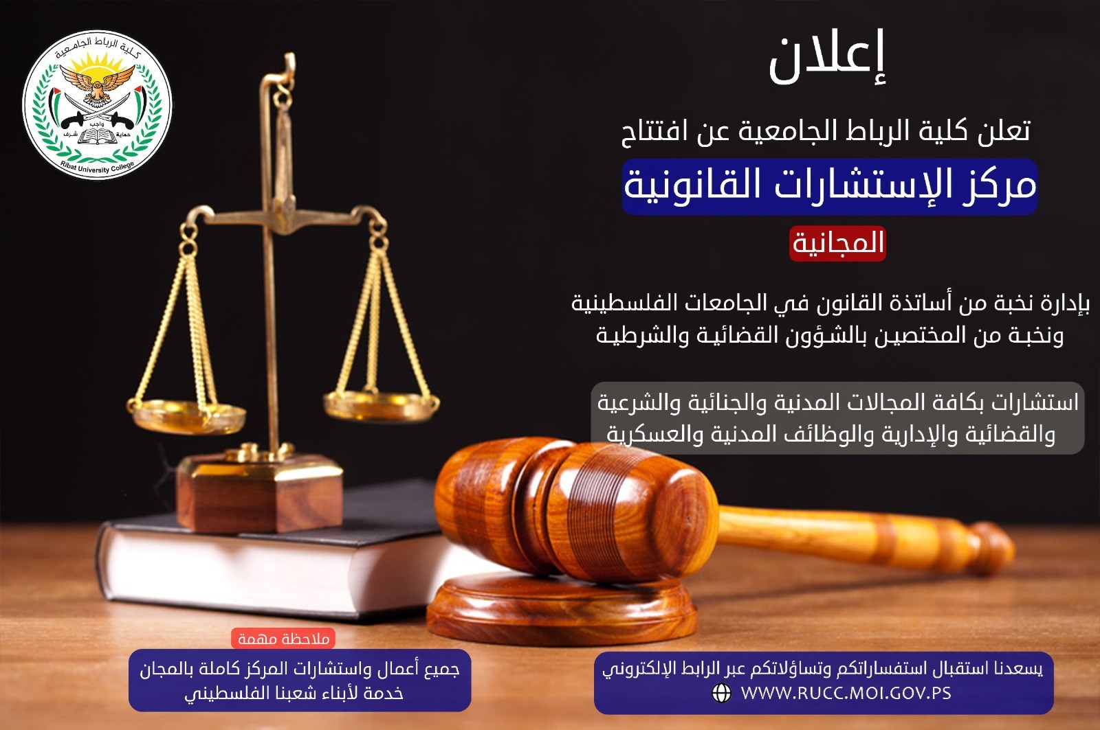 تُعلن كلية الرباط الجامعية بوزارة الداخلية والأمن الوطني، عن افتتاح مركز إلكتروني لتقديم الاستشارات القانونية "المجانية"، بإدارة نخبة من أساتذة القانون في الجامعات الفلسطينية، ونخبة من المختصين بالشؤون القضائية والشرطية.