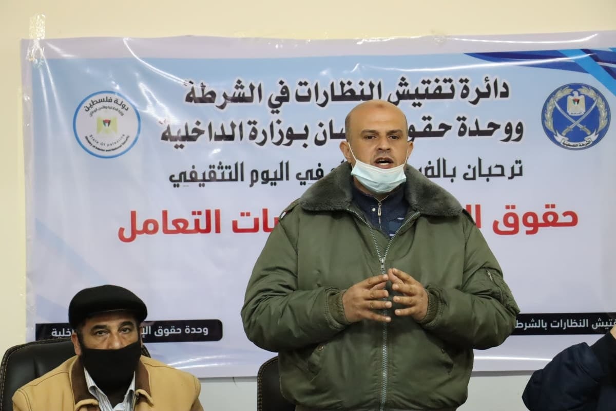 فيما تتناول المحاضرة الثانية موضوع "حقوق الموقوفين التي كفلها القانون" يقدمها المستشار القانوني نقيب حقوقي أ. خليل أبو بشارة ممثلا عن وحدة حقوق الإنسان.