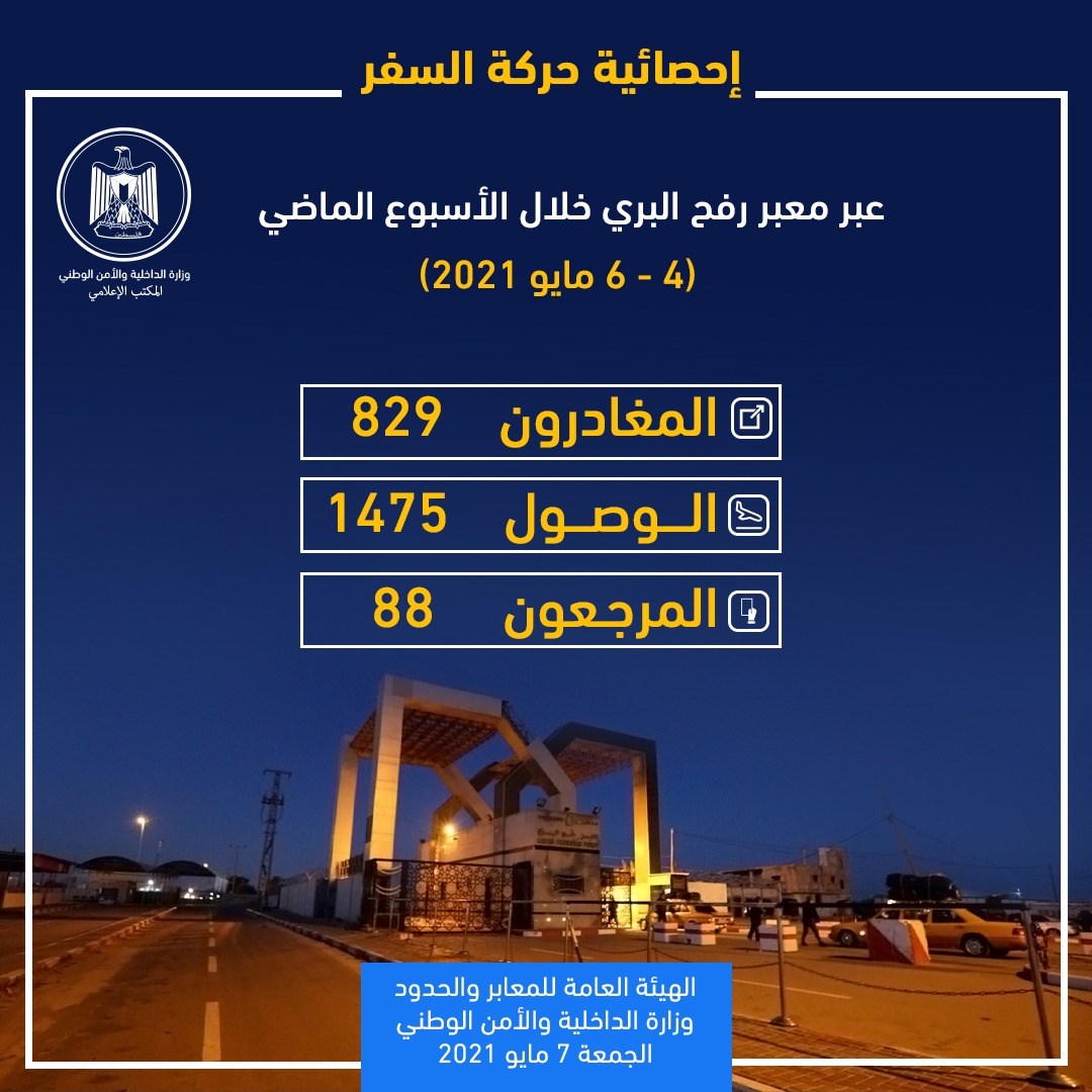 وقالت الهيئة العامة للمعابر والحدود بوزارة الداخلية، في إحصائية نشرتها صباح اليوم الجمعة "إن العمل عبر المعبر شهد الأسبوع الماضي مغادرة 829 مسافرًا، ووصول 1475 عائداً، في حين أرجعت السلطات المصرية 88 مسافراً.