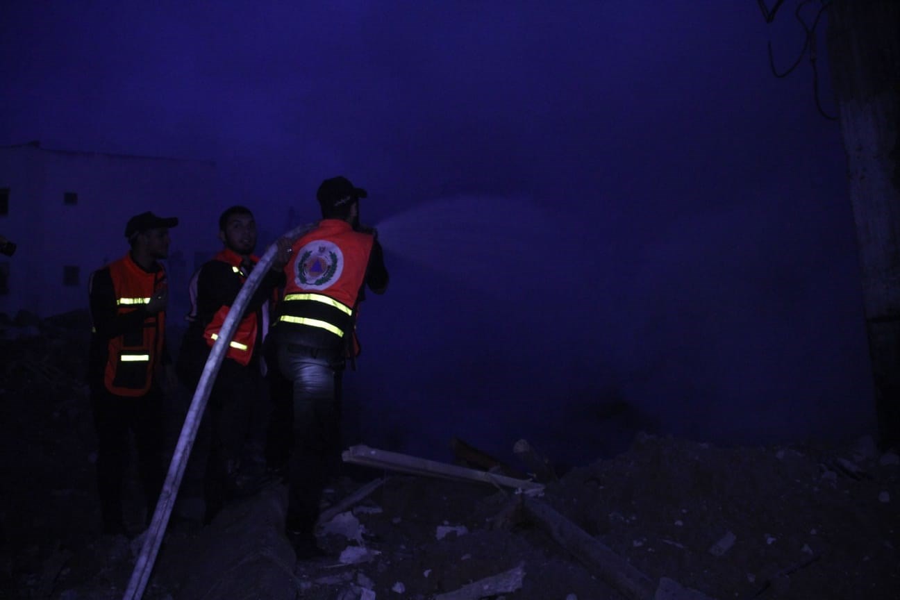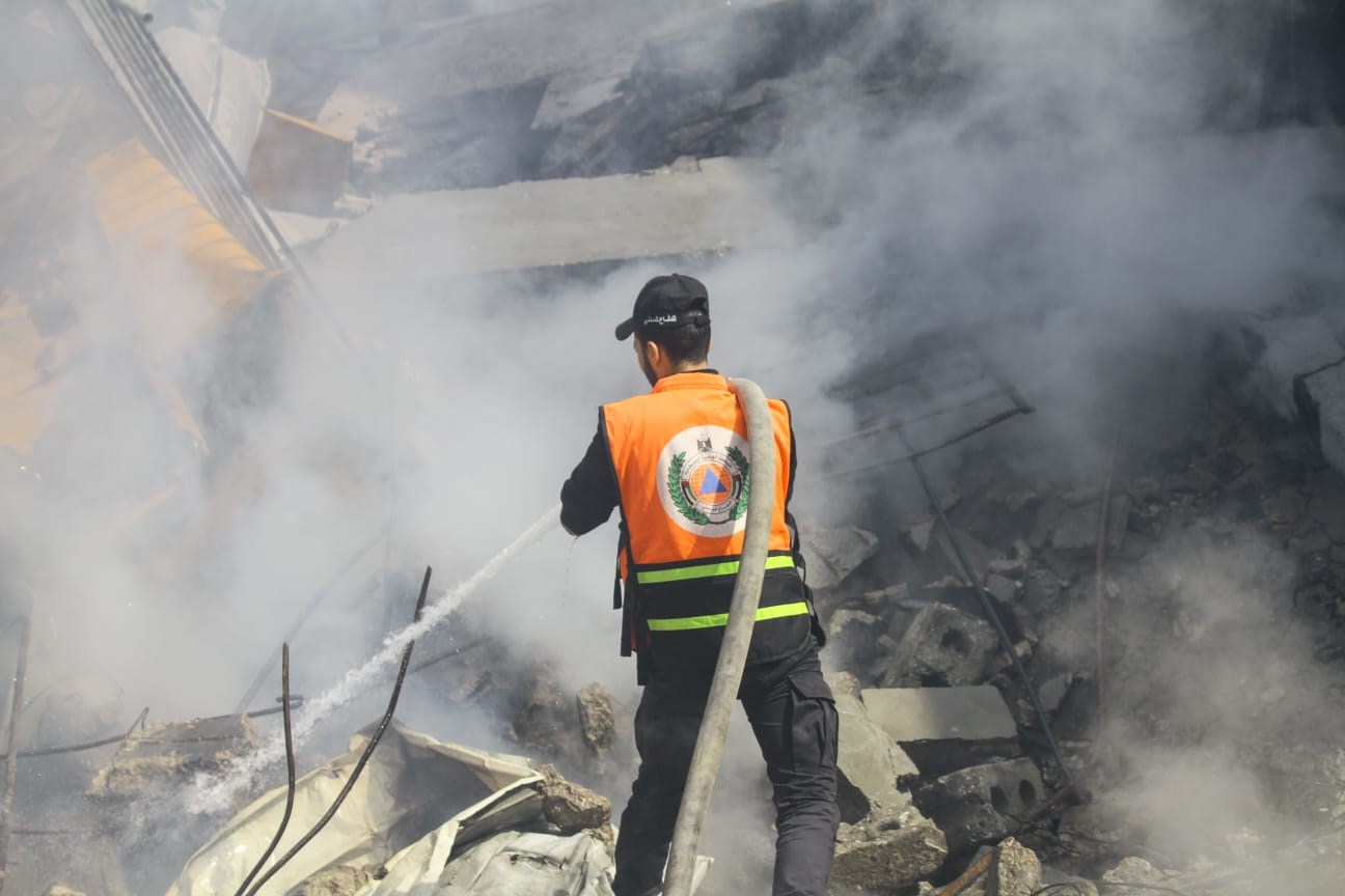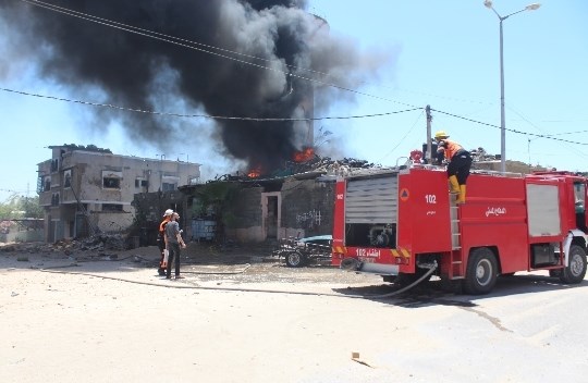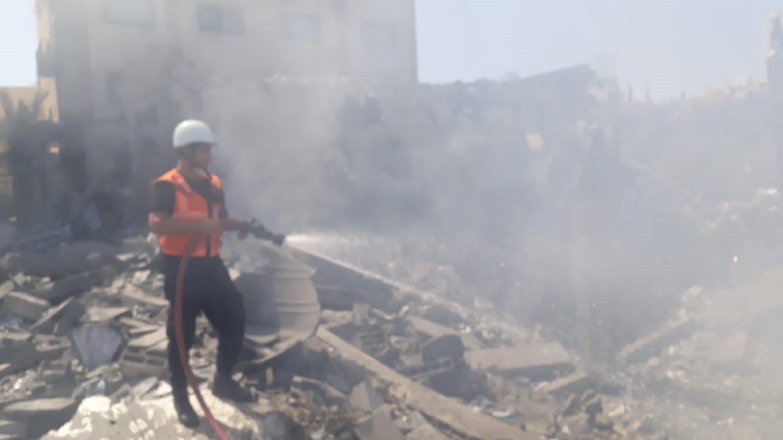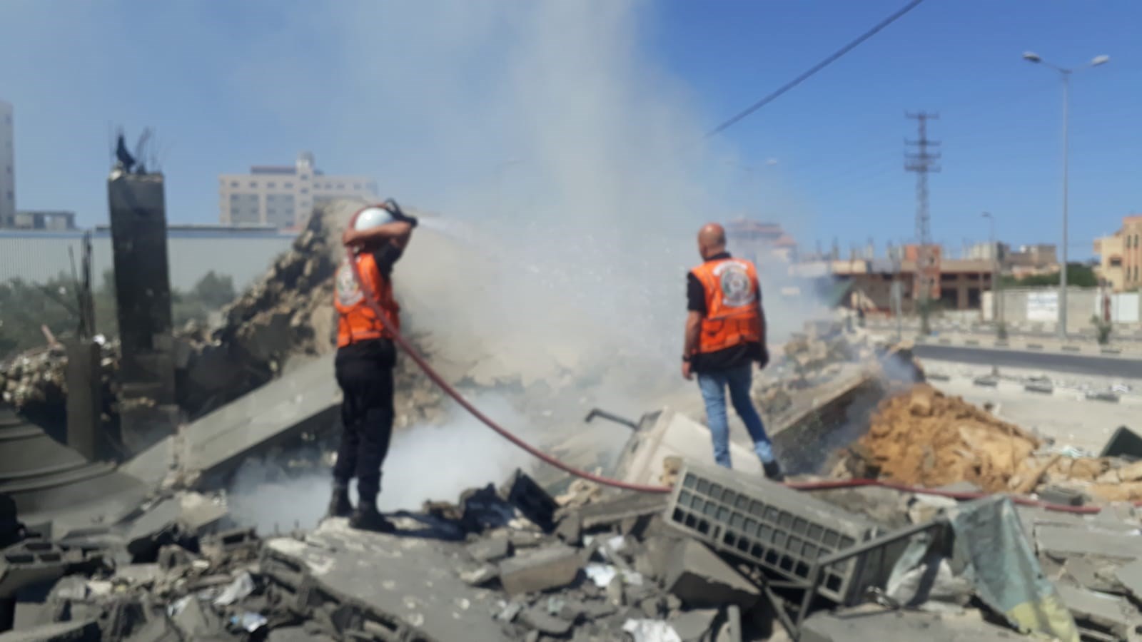 فيما أخمدت طواقم الإطفاء حريقا شبّ في عمارة بمنطقة الرمال وسط غزة، إثر استهدافها من طيران الاحتلال.