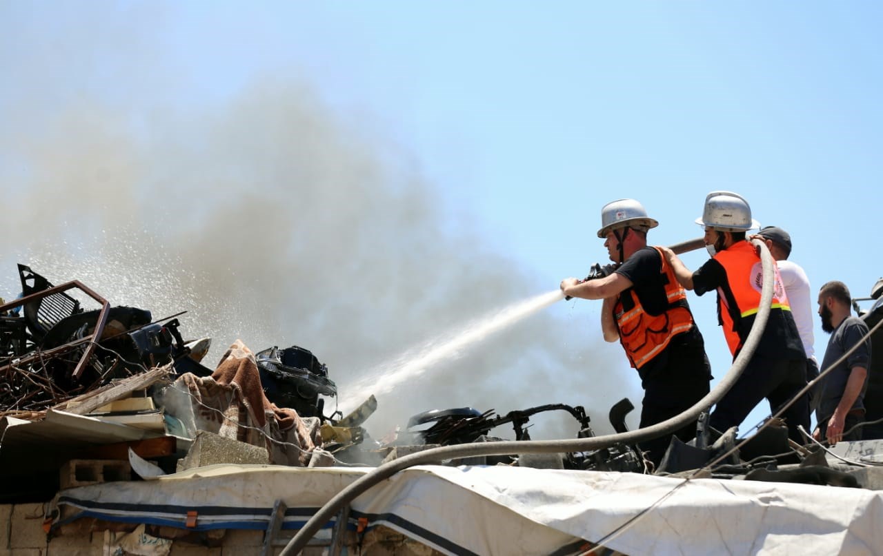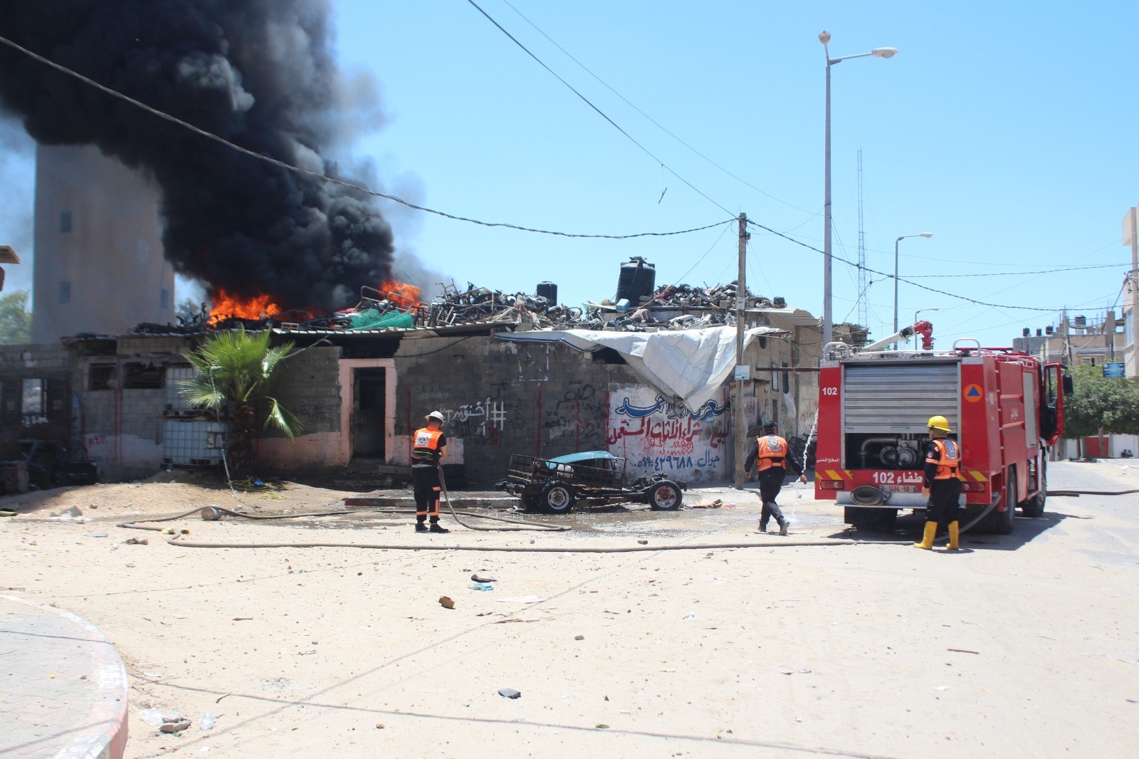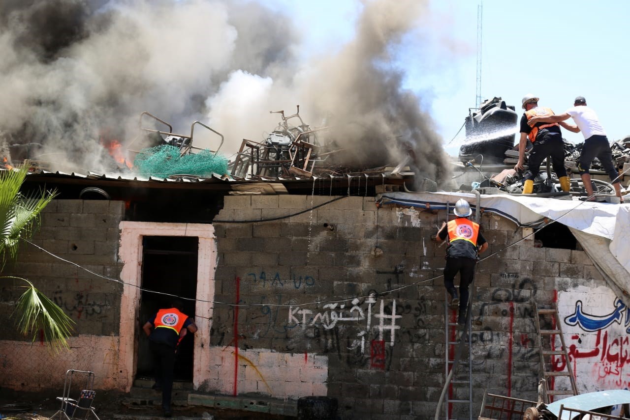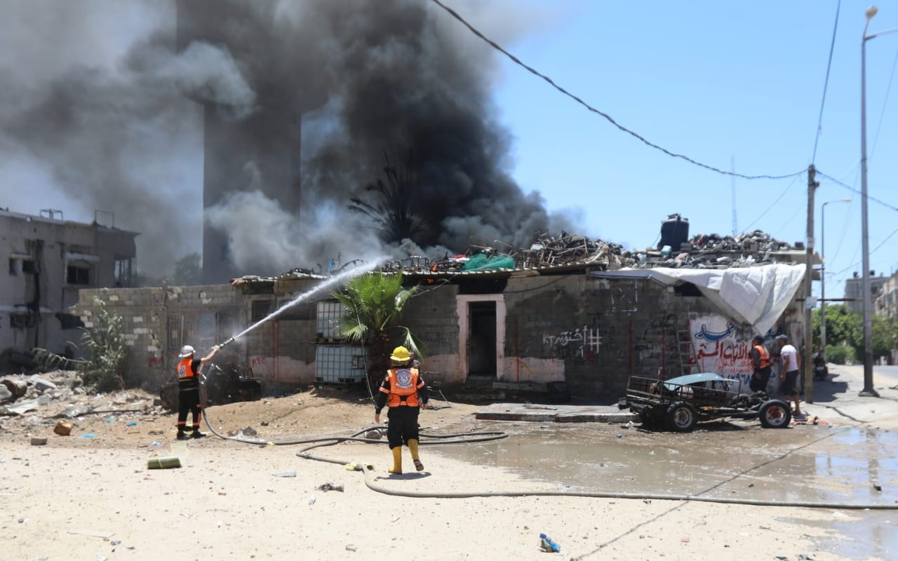 فيما أخمدت طواقم الإطفاء حريقا شبّ في عمارة بمنطقة الرمال وسط غزة، إثر استهدافها من طيران الاحتلال.