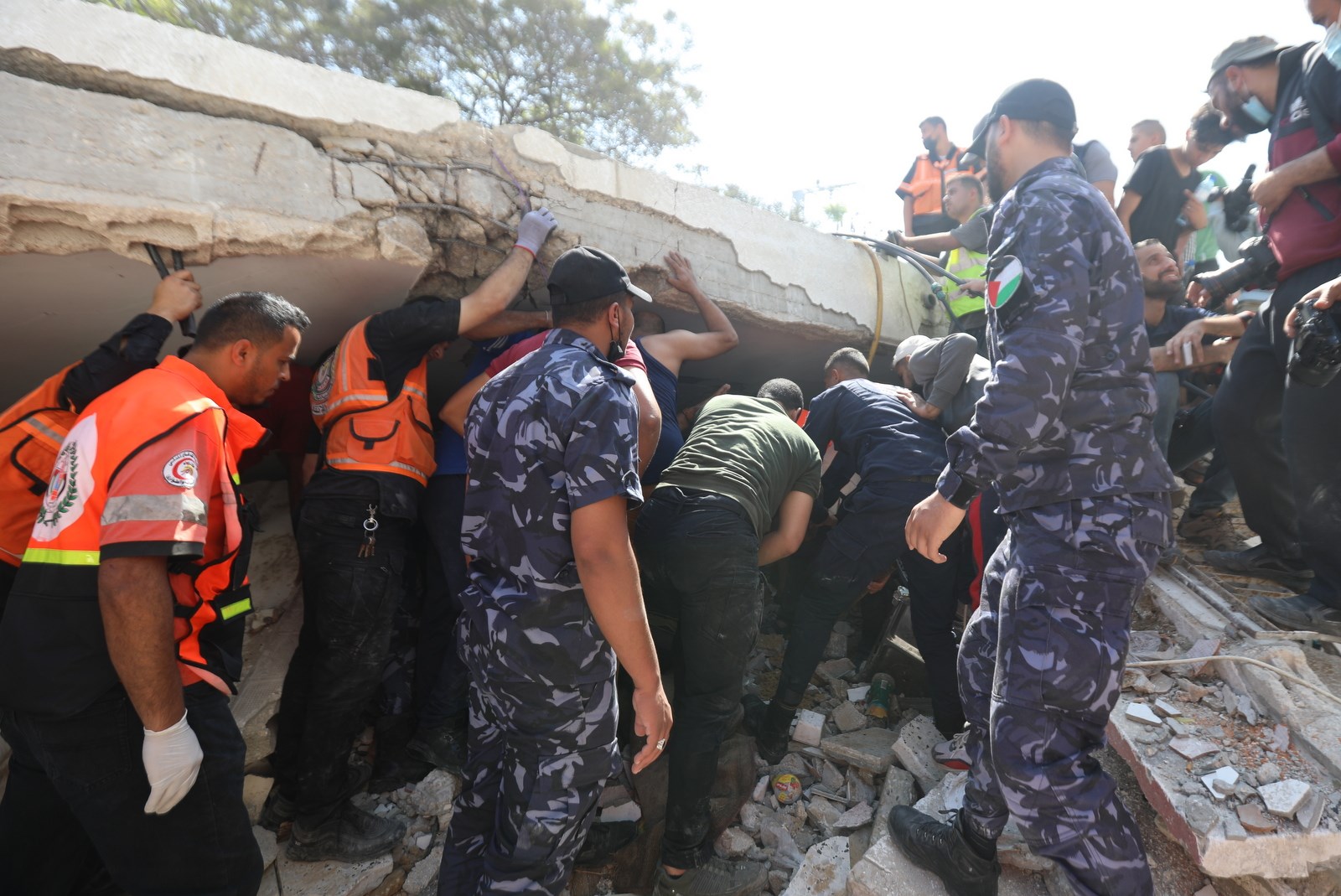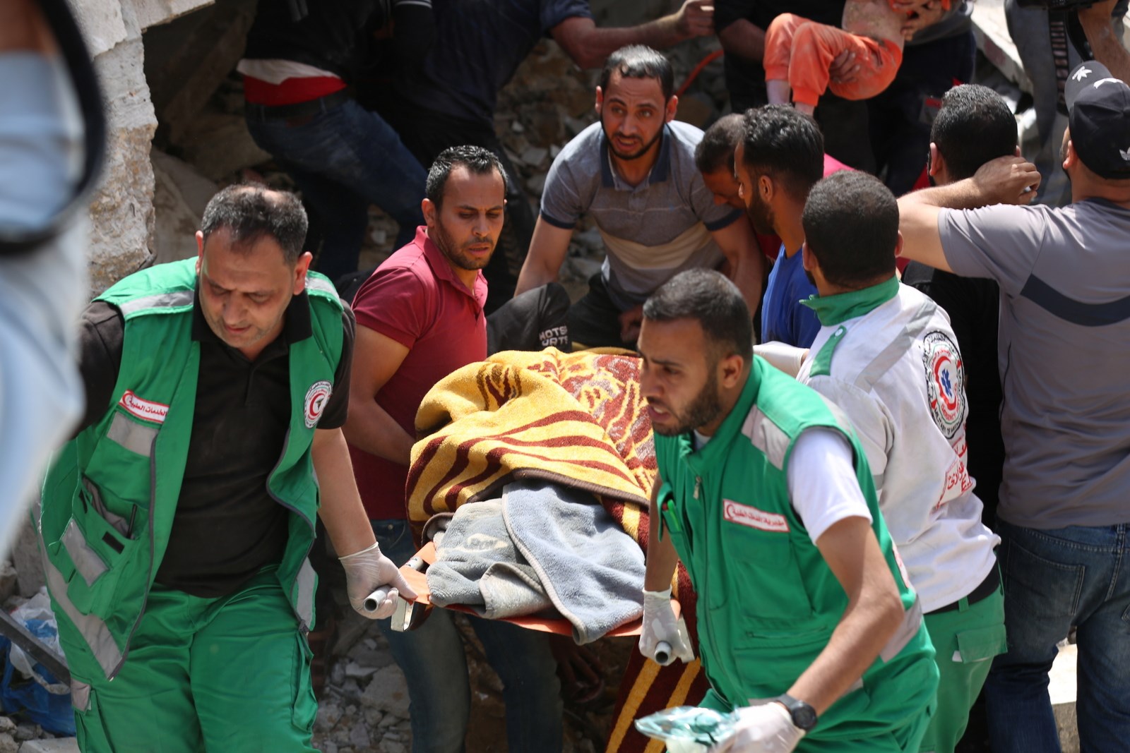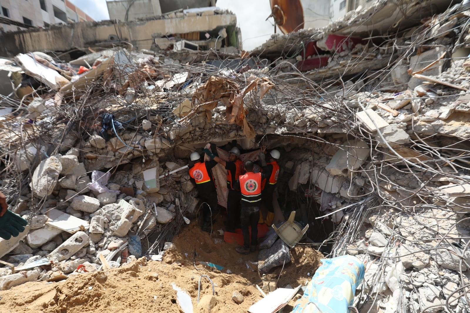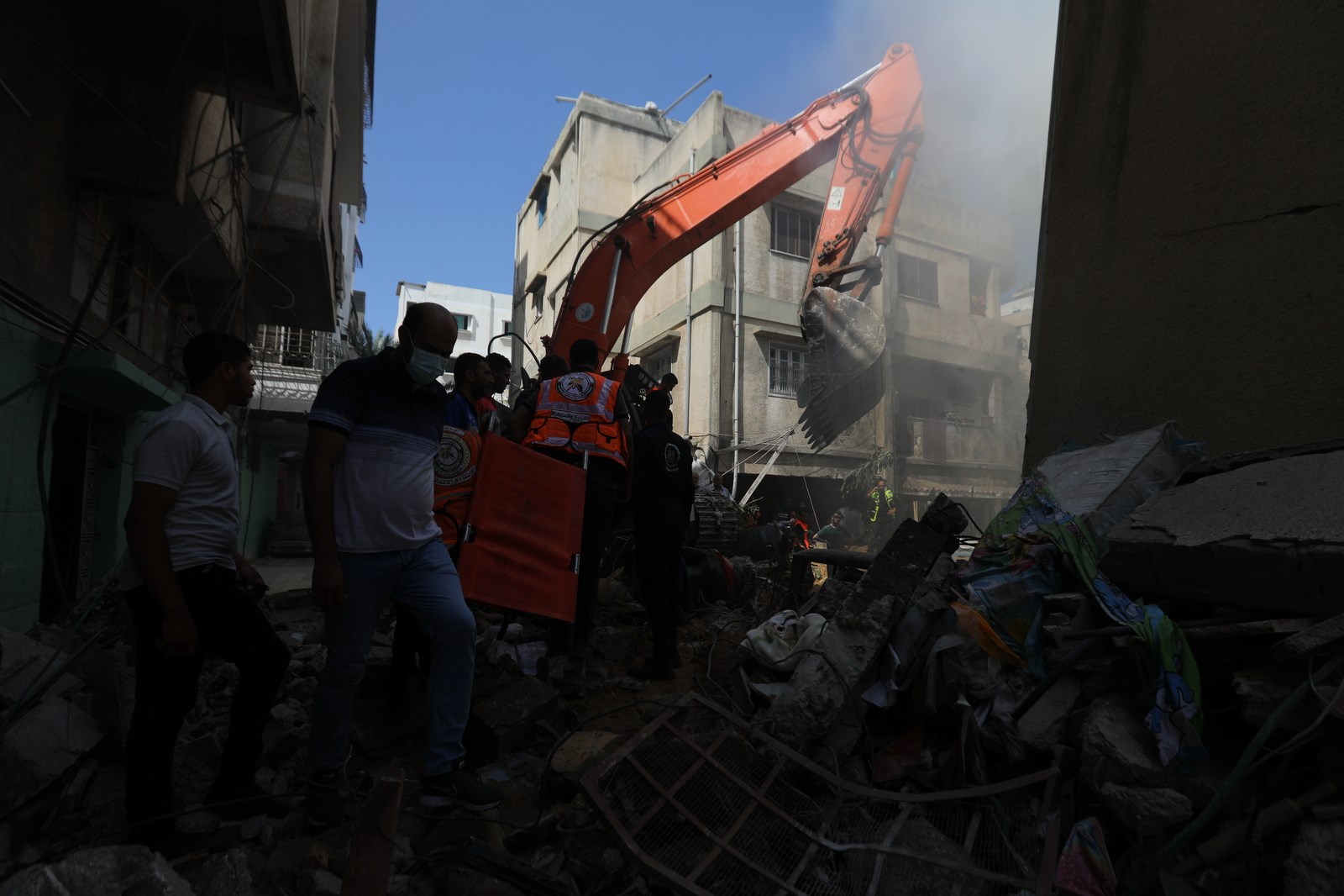 وتعمل الأطقم الطبية والخدماتية على إنقاذ المصابين وانتشال جثامين الشهداء من بين ركام المنازل المدمرة في منطقة حي الرمال بمدينة غزة.