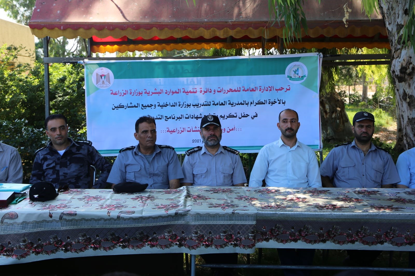 اختتمت مديرية التدريب صباح اليوم الخميس، البرنامج التدريبي " أمن وحماية المنشآت الزراعية " لموظفي وزارة الزراعة بالأراضي المحررة بمدينة خانيونس.