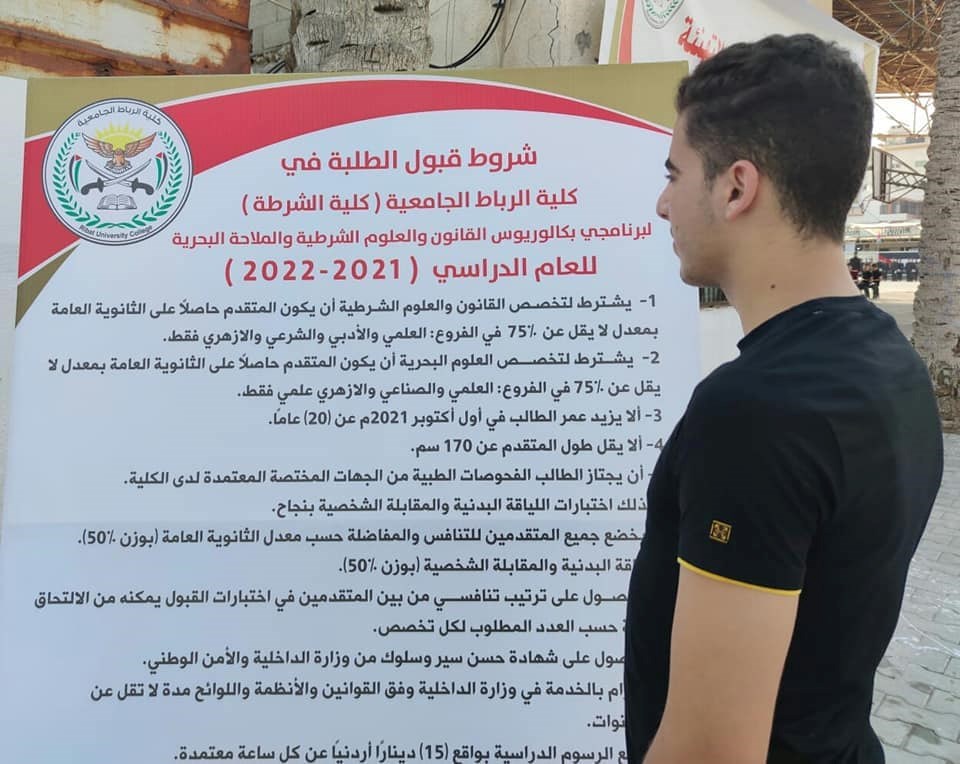 شرعت كلية الرباط الجامعية التابعة لوزارة الداخلية، صباح الأحد، في استقبال طلبات وأوراق التحاق الطلاب الجدد الناجحين في الثانوية العامة للعام الدراسي 2021-2022م، والراغبين بالالتحاق في تخصص بكالوريوس القانون والعلوم الشرطية وتخصص بكالوريوس الملاحة البحرية.