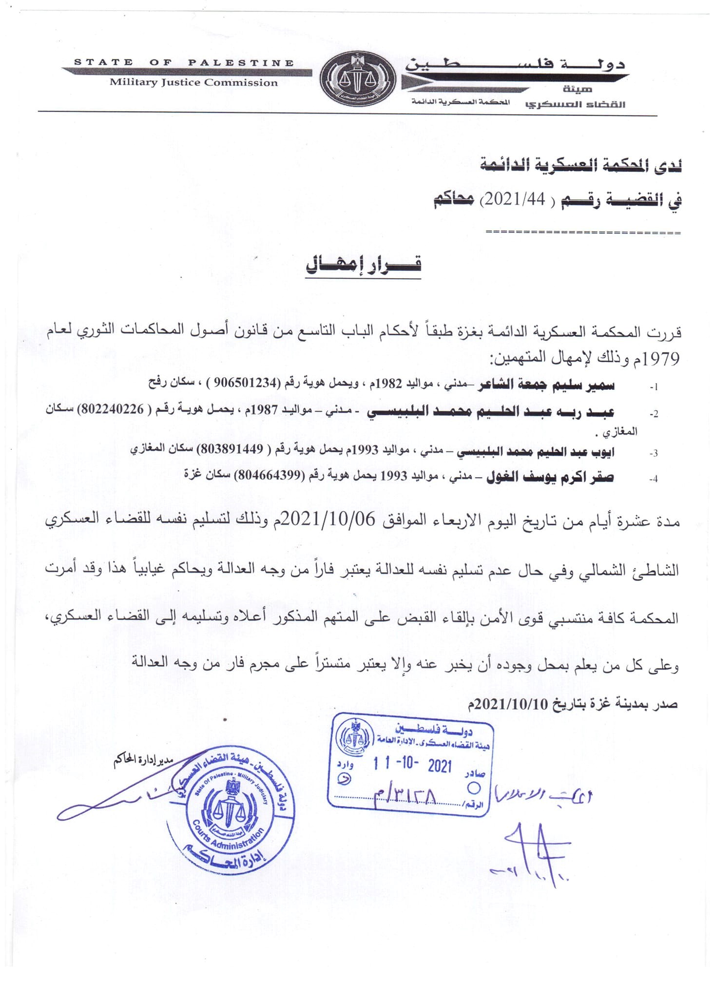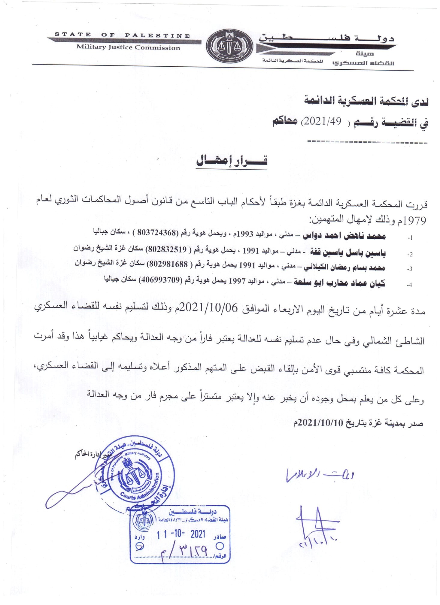 أمهلت المحكمة العسكرية الدائمة- التابعة لهيئة القضاء العسكري 8 متهمين، عشرة أيام من تاريخ يوم الأربعاء الموافق 06/10/2021، لتسليم أنفسهم للقضاء العسكري.