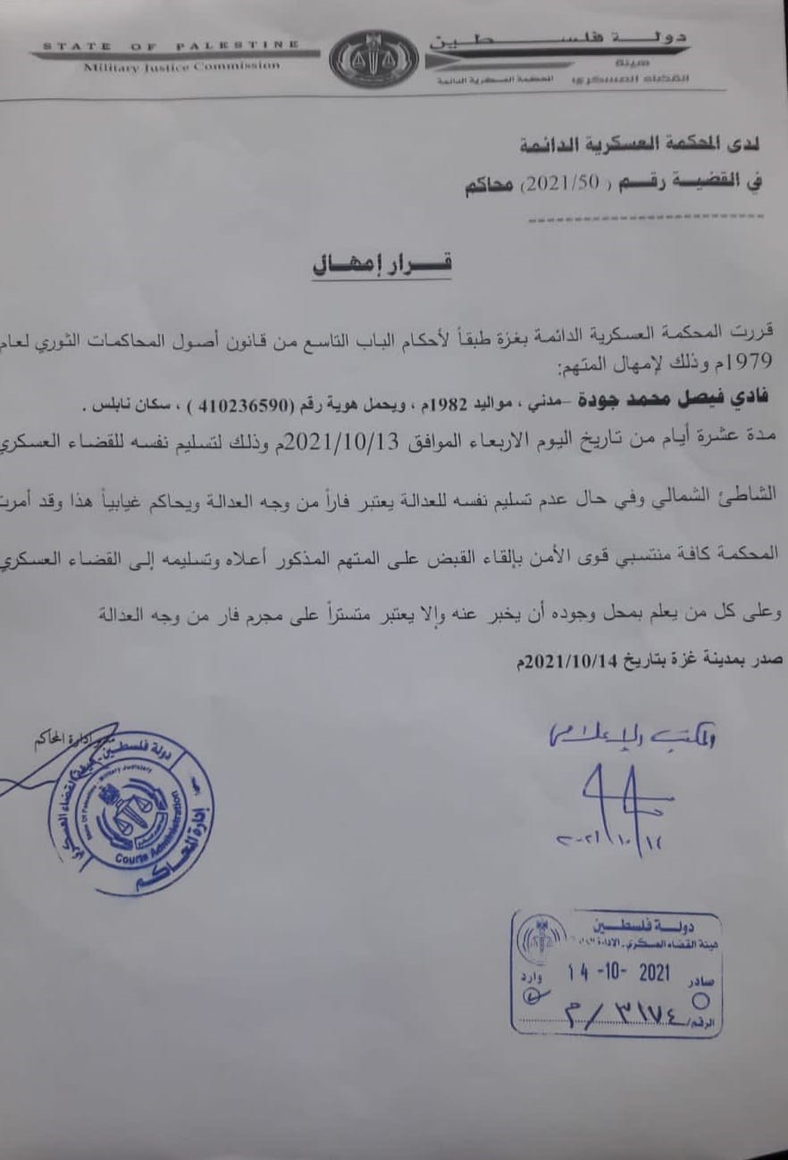 أمهلت المحكمة العسكرية الدائمة- التابعة لهيئة القضاء العسكري المتهم فادي فيصل محمد جودة، هوية رقم (410236590)، سكان نابلس، عشرة أيام من تاريخ يوم الأربعاء الموافق13/10/2021م، لتسليم نفسه للقضاء العسكري.