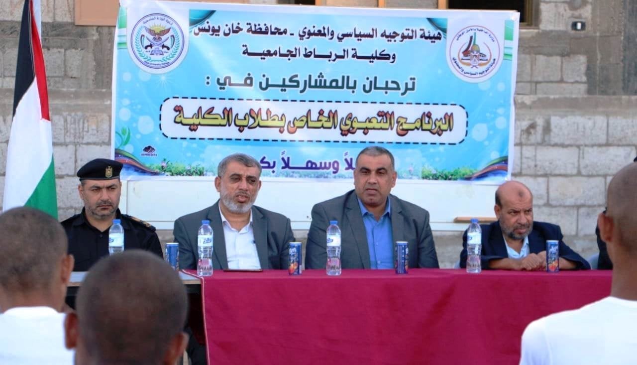 افتتحت هيئة التوجيه السياسي والمعنوي في محافظة خانيونس، برنامجًا تعبويًا لطلاب كلية الرباط الجامعية.