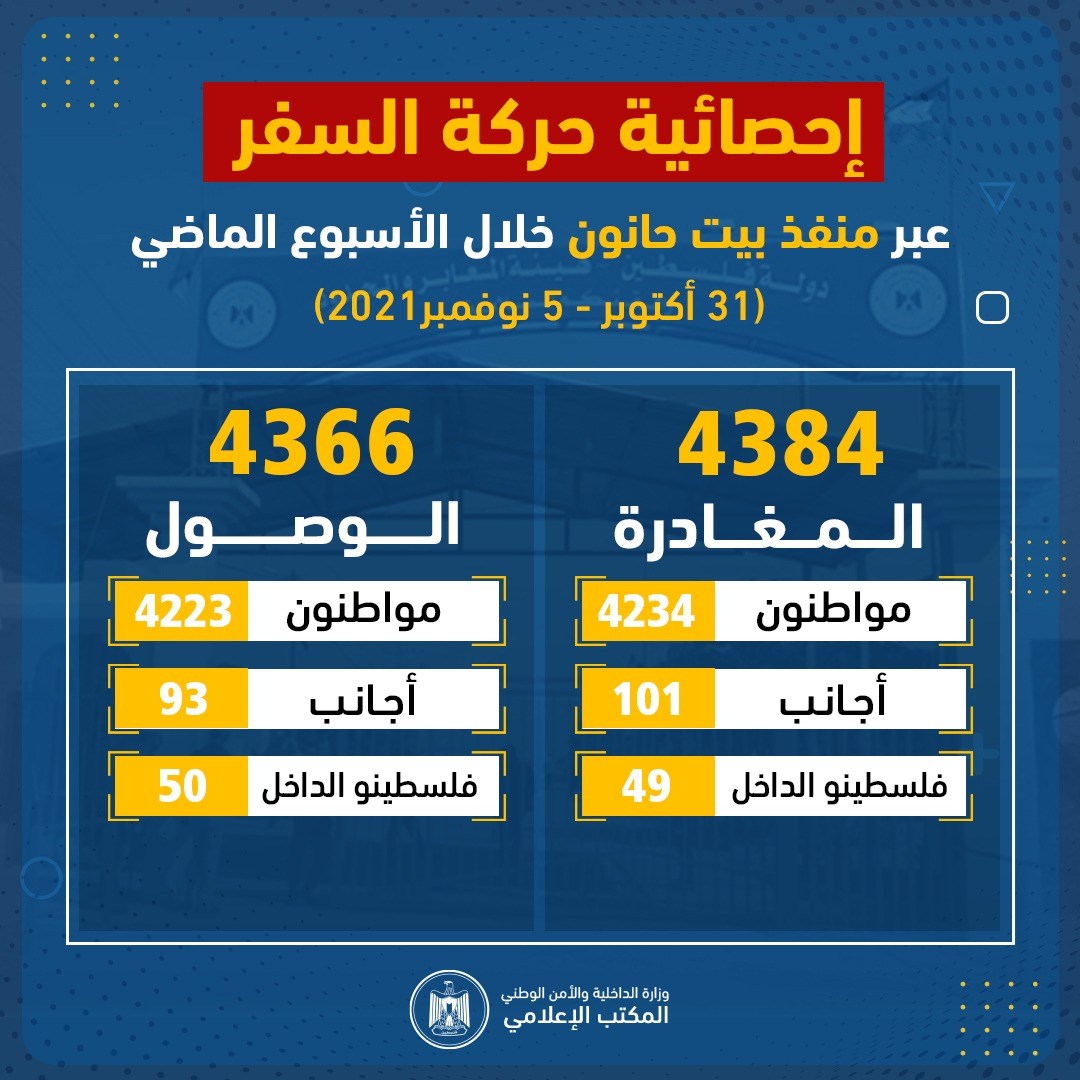 نشرت الهيئة العامة للمعابر والحدود بوزارة الداخلية والأمن الوطني، صباح السبت، إحصائية حركة التنقل عبر منفذ بيت حانون شمال قطاع غزة خلال الأسبوع الماضي (31 أكتوبر- 5 نوفمبر 2021).