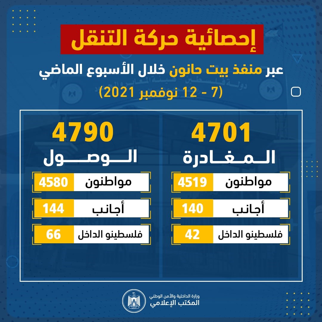 نشرت الهيئة العامة للمعابر والحدود بوزارة الداخلية والأمن الوطني، صباح السبت، إحصائية حركة التنقل عبر منفذ بيت حانون شمال قطاع غزة خلال الأسبوع الماضي (7 - 12 نوفمبر 2021).