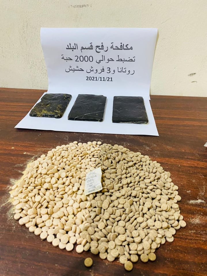وفي سياق منفصل، ضبطت دائرة شرطة مكافحة المخدرات بمحافظة الشمال بالاشتراك مع مكافحة المخدرات برفح 3 فروش حشيش، و2000 حبة مخدرة من نوع "روتانا" خلال مهمة تفتيشية لمنزل أحد مروجي المخدرات بمحافظة رفح.