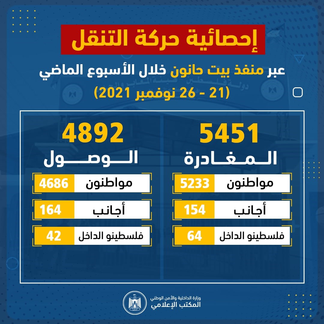 نشرت الهيئة العامة للمعابر والحدود بوزارة الداخلية والأمن الوطني، صباح السبت، إحصائية حركة التنقل عبر منفذ بيت حانون شمال قطاع غزة خلال الأسبوع الماضي (21- 26 نوفمبر 2021).