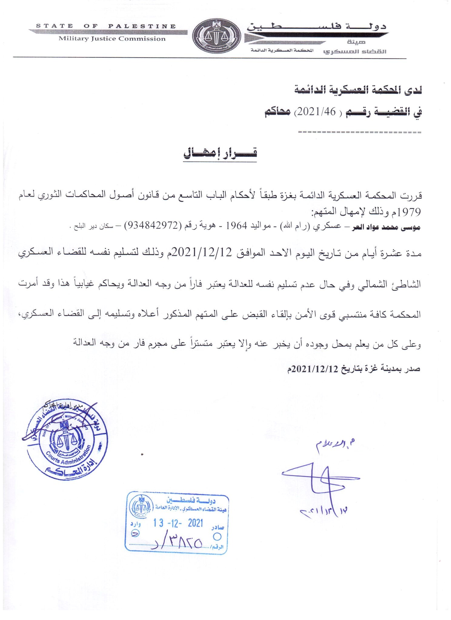 أمهلت المحكمة العسكرية الدائمة- التابعة لهيئة القضاء العسكري في قرارين منفصلين المتهم موسى محمد عواد العر، هوية رقم (934842972) ،سكان دير البلح، والمتهم/ حامد حمدان محمد أبو الكاس، هوية رقم (403012974)، سكان مدينة غزة، عشرة أيام من تاريخ يوم الأحد الموافق 12/12/2021م، لتسليم نفسيهما للقضاء العسكري.