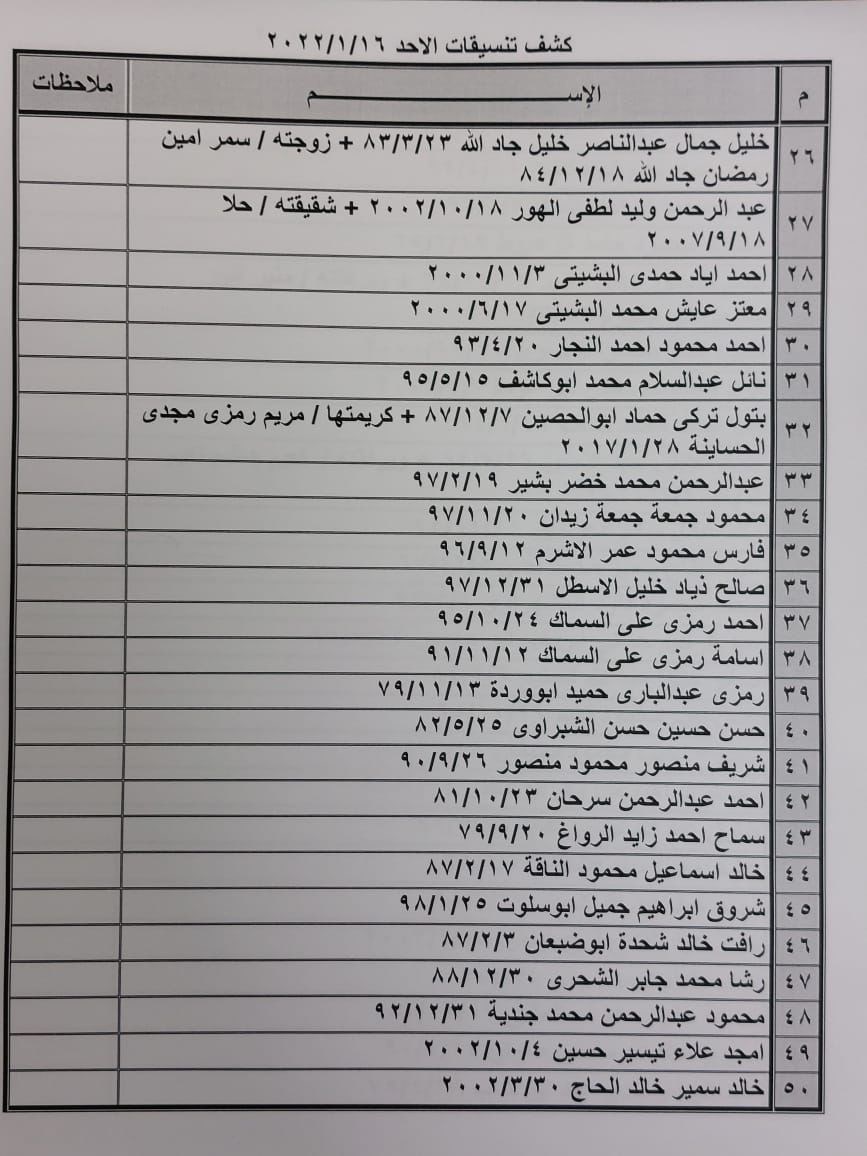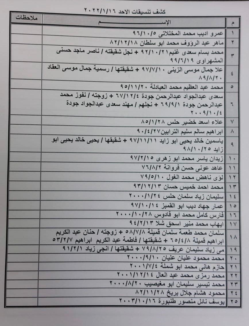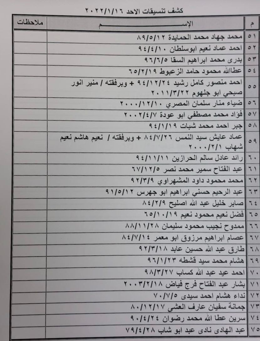 تعلن الهيئة العامة للمعابر والحدود بوزارة الداخلية والأمن الوطني عن وصول كشف "تنسيقات مصرية" للسفر عبر معبر رفح البري يوم غد الأحد (16 يناير)، والذين عليهم التوجه لإجراء فحص كورونا الساعة 7 صباح الأحد بمركز شـ.ـهداء رفح الصحي ثم التوجه للصالة الخارجية للمعبر لتسهيل سفرهم.