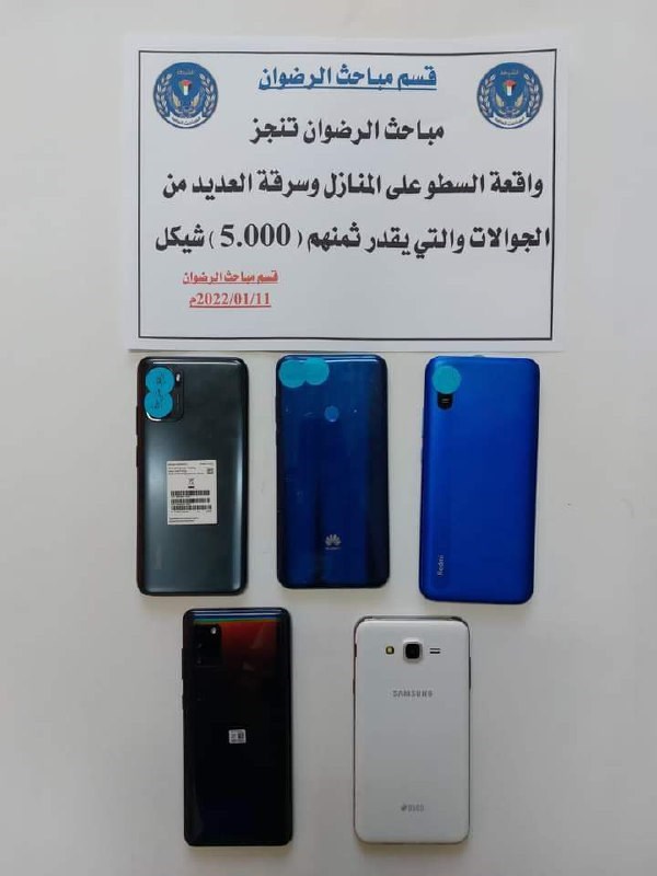 أنجزت المباحث العامة – قسم مباحث الرضوان بمحافظة غزة عدة شكاوى تقدم بها مواطنون حول سرقة أجهزتهم المحمولة من داخل منازلهم تقدر قيمتهم الإجمالية بـ 5 آلاف شيكل.