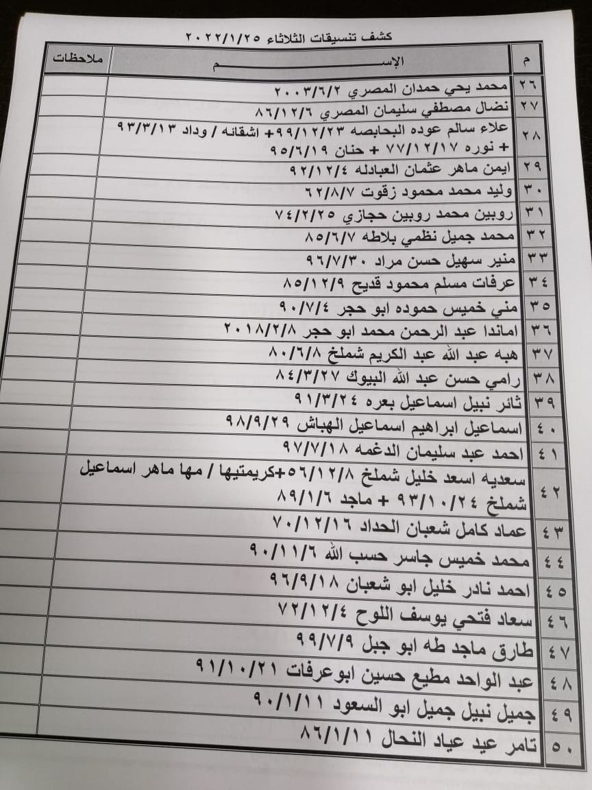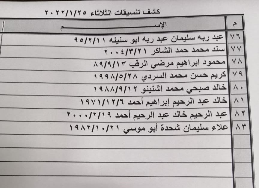 تعلن الهيئة العامة للمعابر والحدود بوزارة الداخلية والأمن الوطني عن وصول كشف "تنسيقات مصرية" للسفر عبر معبر رفح البري يوم الثلاثاء (25 يناير)، والذين عليهم التوجه لإجراء فحص كورونا بدءاً من الساعة 9 صباح الإثنين في المراكز الصحية المعلن عنها مسبقاً بجميع المحافظات.