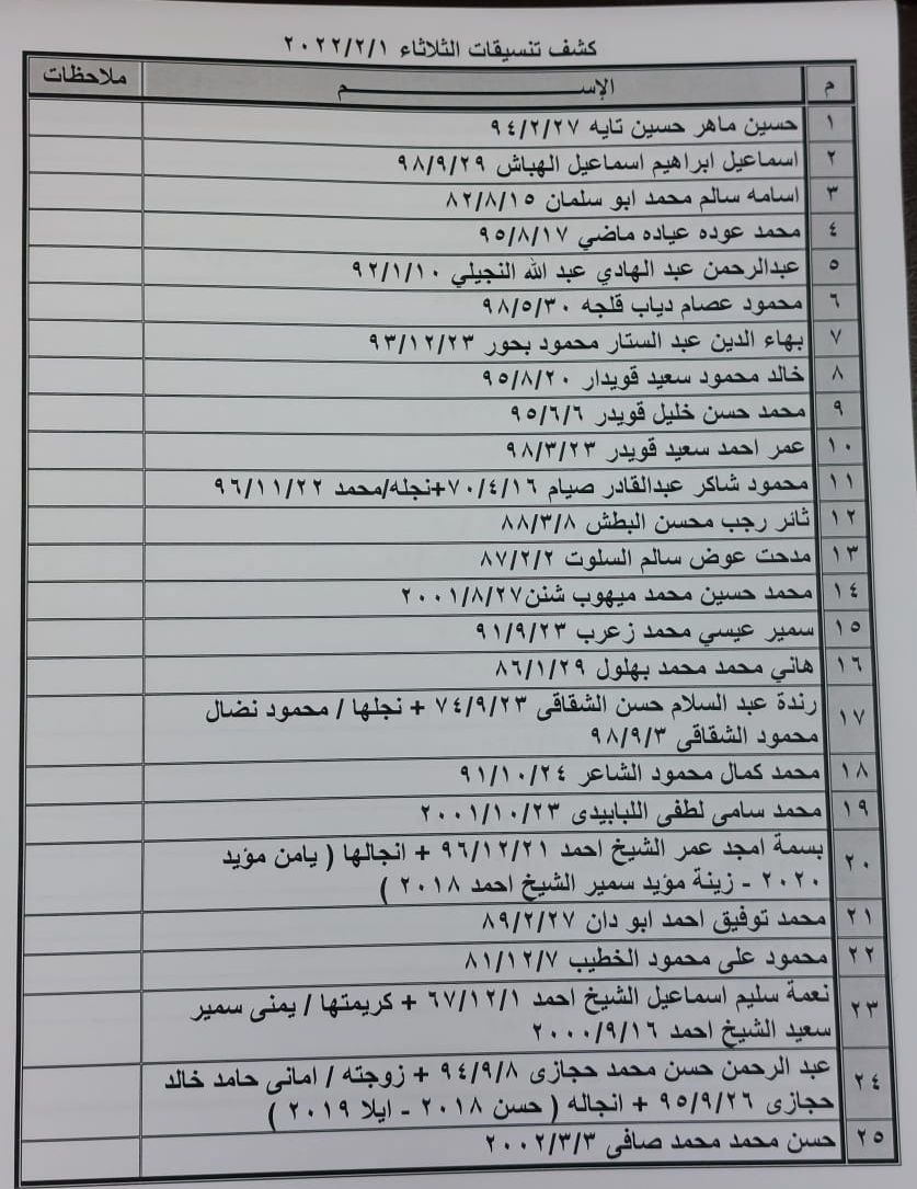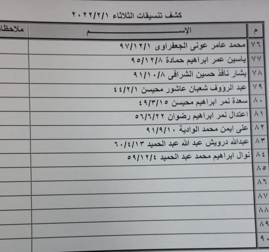 تعلن الهيئة العامة للمعابر والحدود بوزارة الداخلية والأمن الوطني عن وصول كشف "تنسيقات مصرية" للسفر عبر معبر رفح البري يوم الثلاثاء (1 فبراير)، والذين عليهم التوجه لإجراء فحص كورونا بدءاً من الساعة 9 صباح الإثنين في المراكز الصحية المعلن عنها مسبقاً بجميع المحافظات.