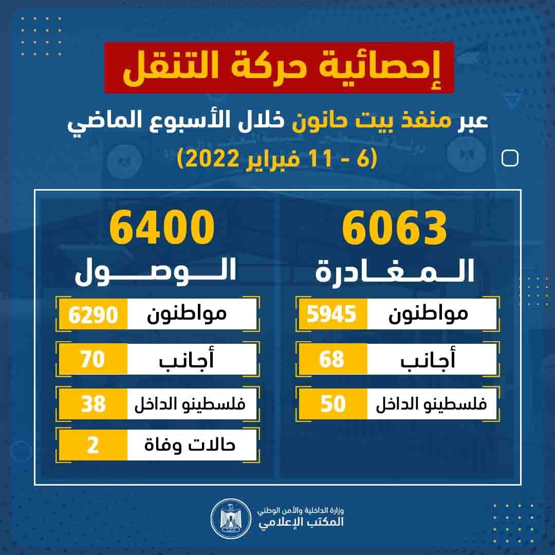 وأوضحت الإحصائية أن إجمالي المغادرة عبر منفذ بيت حانون خلال الأسبوع الماضي بلغت 6063 مغادرين، فيما بلغ عدد الوصول 6400.
