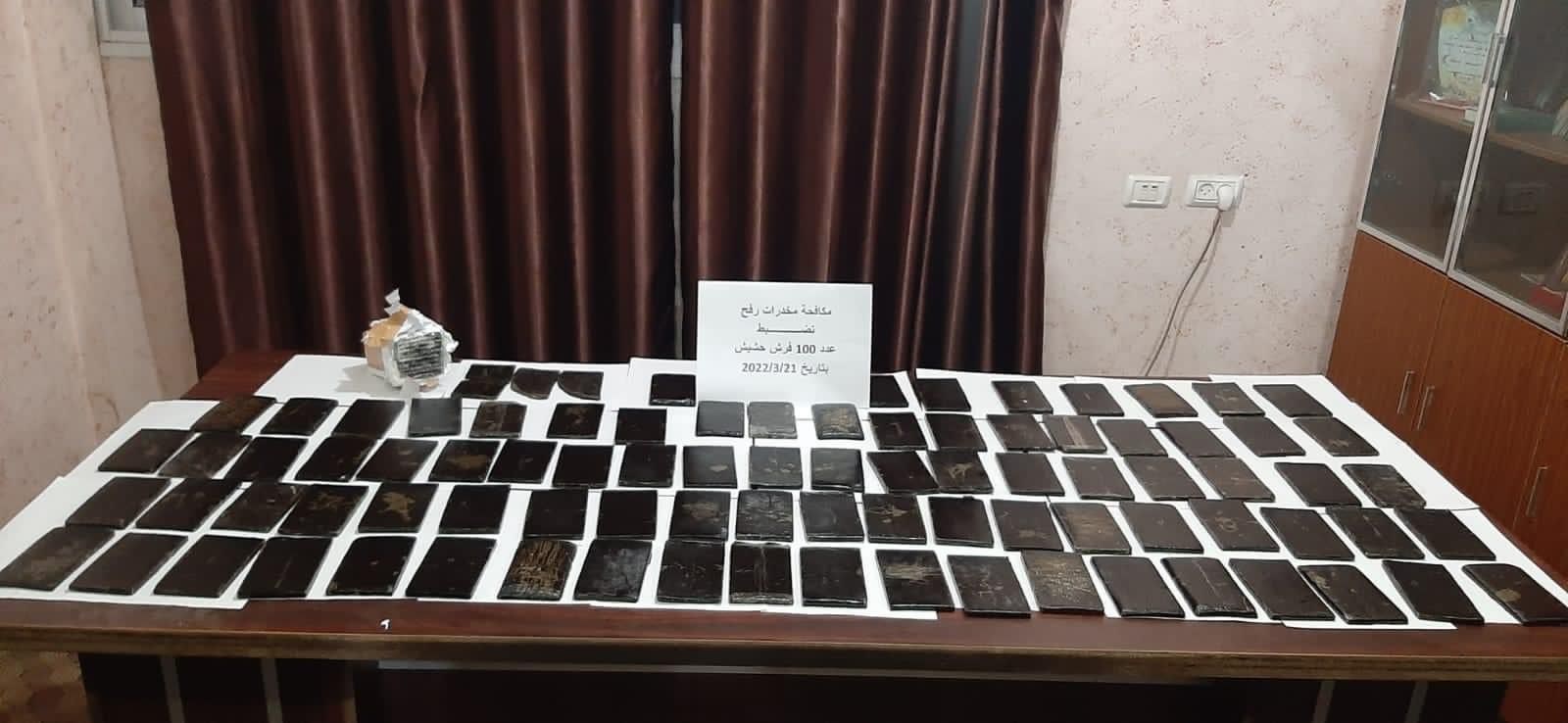 ضبطت إدارة مكافحة المخدرات بشرطة محافظة رفح جنوب قطاع غزة "100" فرش حشيش، خلال كمين لأحد مروجي المخدرات في المحافظة.