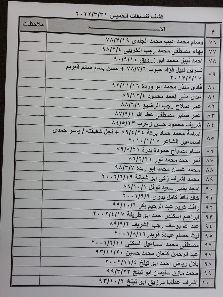 تعلن الهيئة العامة للمعابر والحدود بوزارة الداخلية والأمن الوطني عن وصول كشف "تنسيقات مصرية" للسفر عبر معبر رفح البري يوم الخميس (31 مارس)، والذين عليهم التوجه لإجراء فحص كورونا بدءاً من الساعة 9 صباح الأربعاء في المراكز الصحية المعلن عنها مسبقاً بجميع المحافظات.