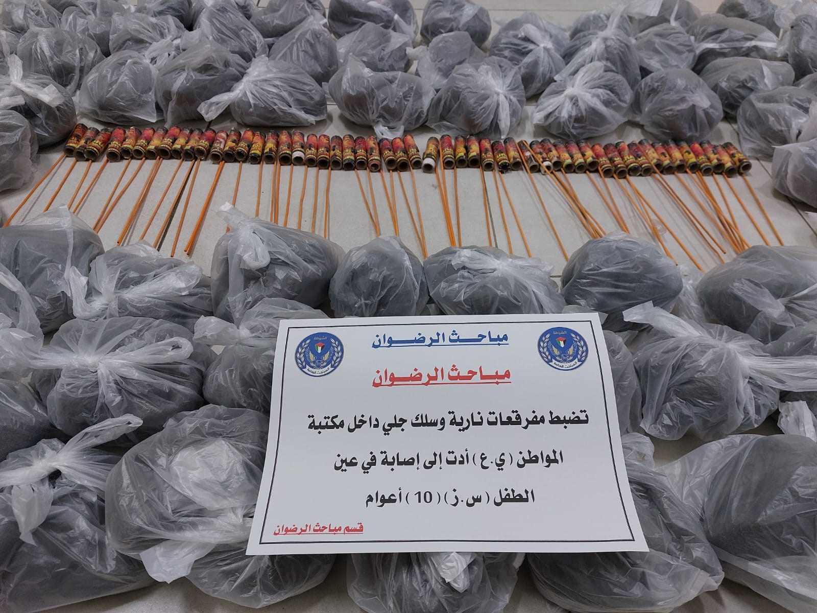 وأوضحت المباحث العامة في قسم الشيخ الرضوان أنها تحرّت عن مصدر مفرقات أسفرت عن إصابة طفل (عشرة أعوام) في عينه بعد عبثه بها، مشيرة أنها ضبطت لدى تاجر 188 قطعة من المفرقعات.