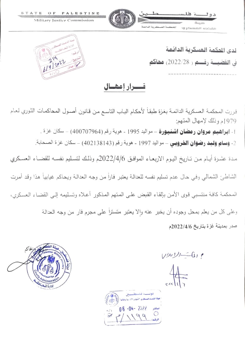 أمهلت المحكمة العسكرية الدائمة- التابعة لهيئة القضاء العسكري المتهم إبراهيم مروان رمضان اشنيورة، هوية رقم (400707964)، سكان مدينة غزة، والمتهم وسام وليد رضوان الخروبي، هوية رقم (402138143)، سكان مدينة غزة-الصحابة، عشرة أيام من تاريخ اليوم الأربعاء الموافق 06/04/2022م، لتسليم نفسيهما للقضاء العسكري.