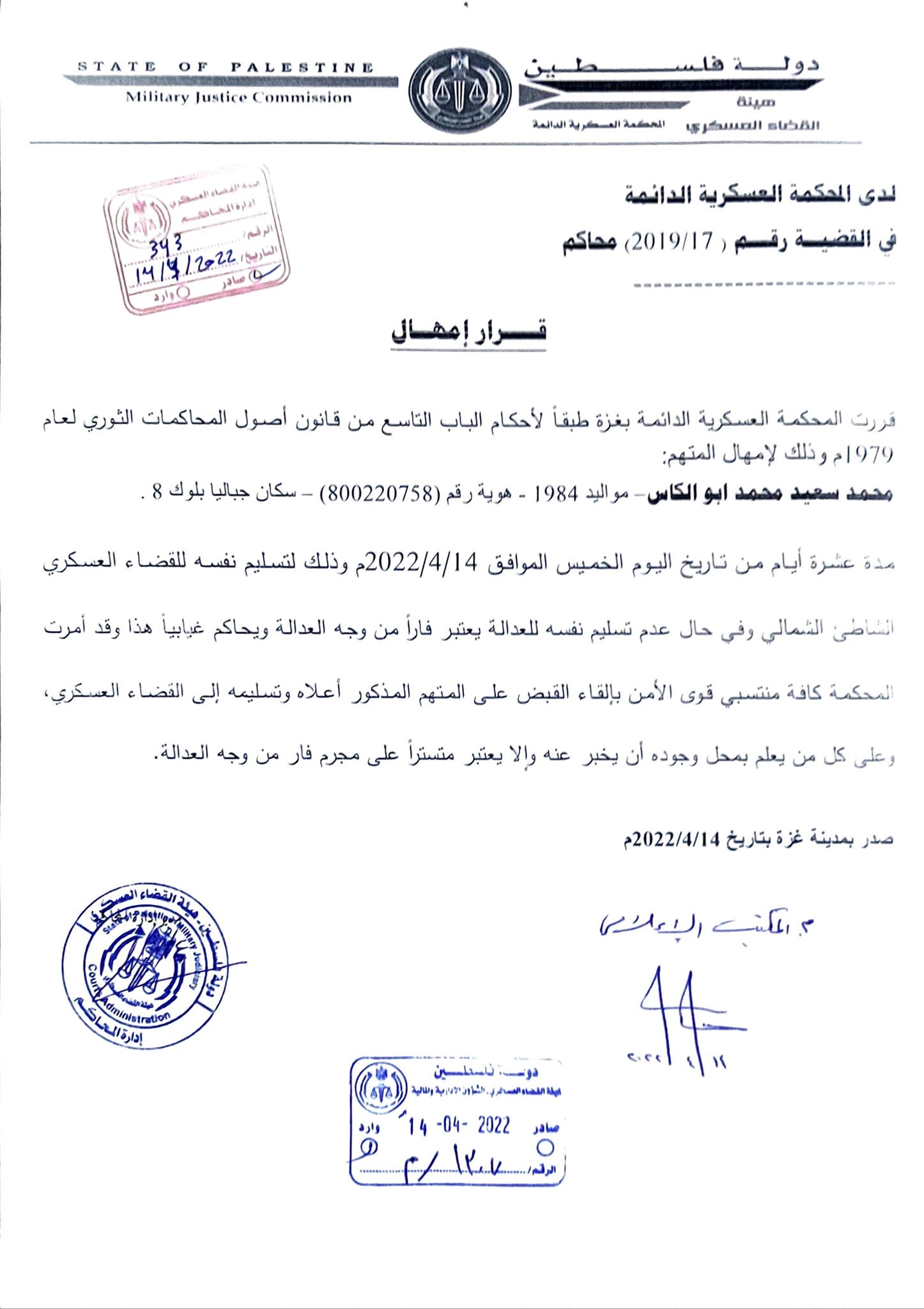 أمهلت المحكمة العسكرية الدائمة- التابعة لهيئة القضاء العسكري المتهم محمد سعيد محمد أبو الكاس، هوية رقم (800220758)، سكان جباليا بلوك 8، عشرة أيام من تاريخ اليوم الخميس الموافق 14/04/2022م، لتسليم نفسه للقضاء العسكري.