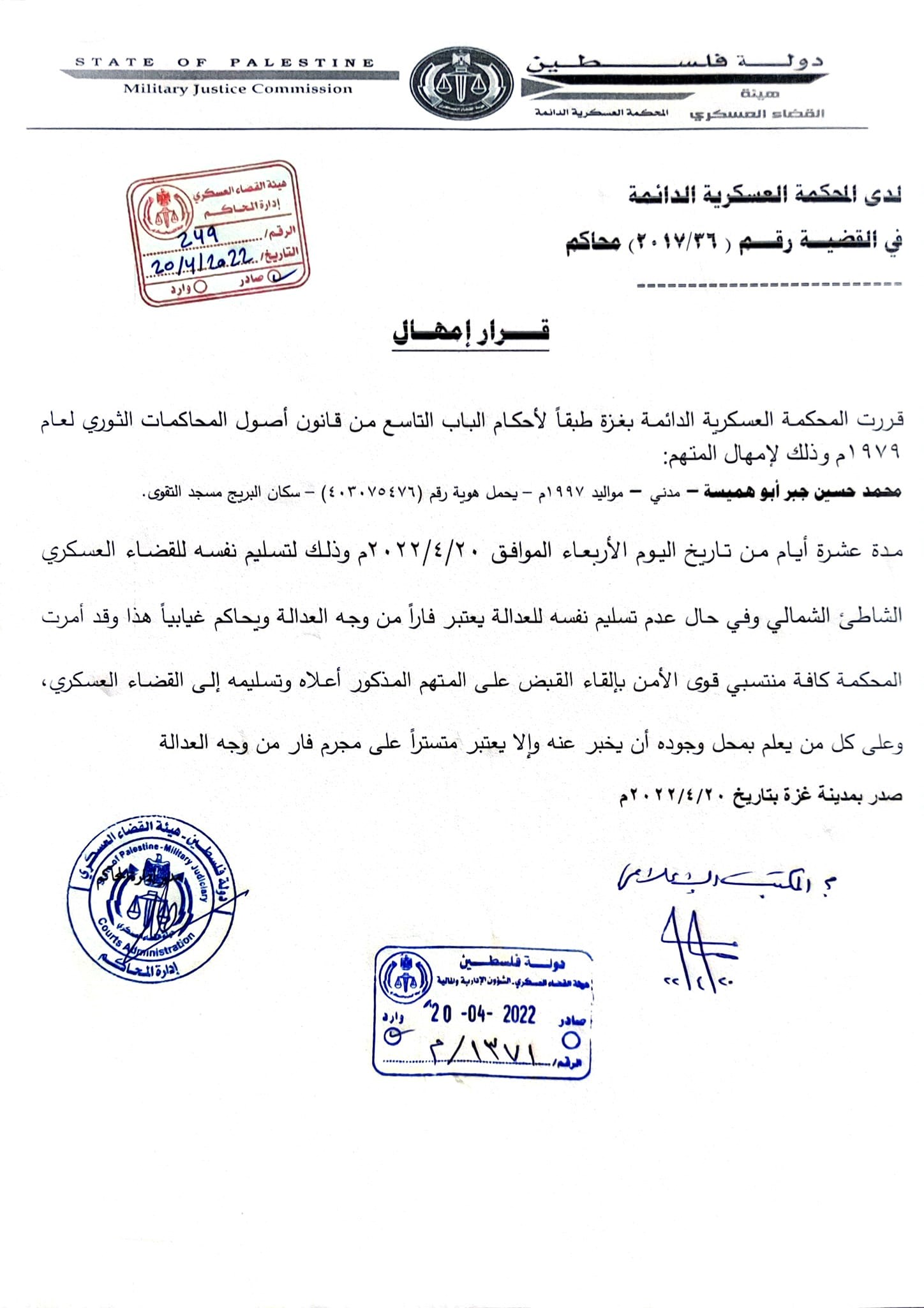 أمهلت المحكمة العسكرية الدائمة- التابعة لهيئة القضاء العسكري المتهم محمد حسين جبر أبو هميسة، هوية رقم (403075476)، سكان البريج مسجد التقوى، عشرة أيام من تاريخ اليوم الأربعاء الموافق 20/04/2022م، لتسليم نفسه للقضاء العسكري.