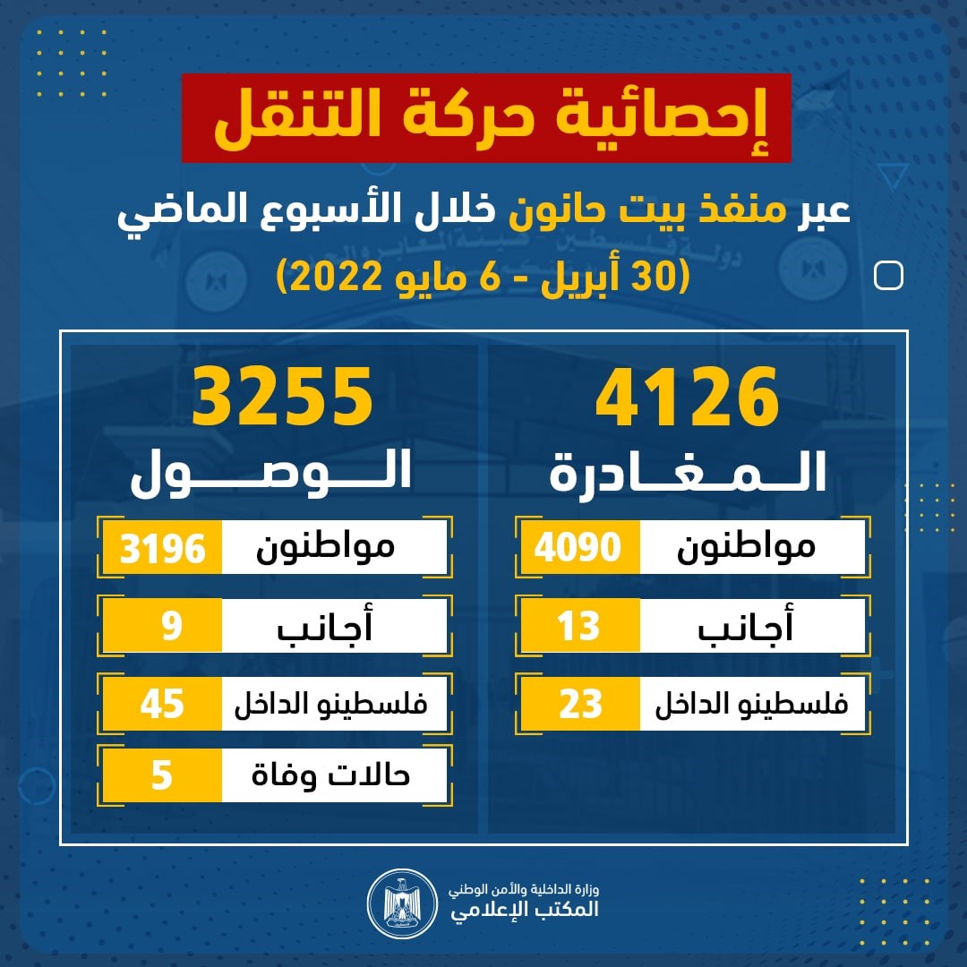 نشرت الهيئة العامة للمعابر والحدود بوزارة الداخلية والأمن الوطني، صباح السبت، إحصائية حركة التنقل عبر منفذ بيت حانون شمال قطاع غزة خلال الأسبوع الماضي (30 إبريل وحتى 6 مايو 2022).