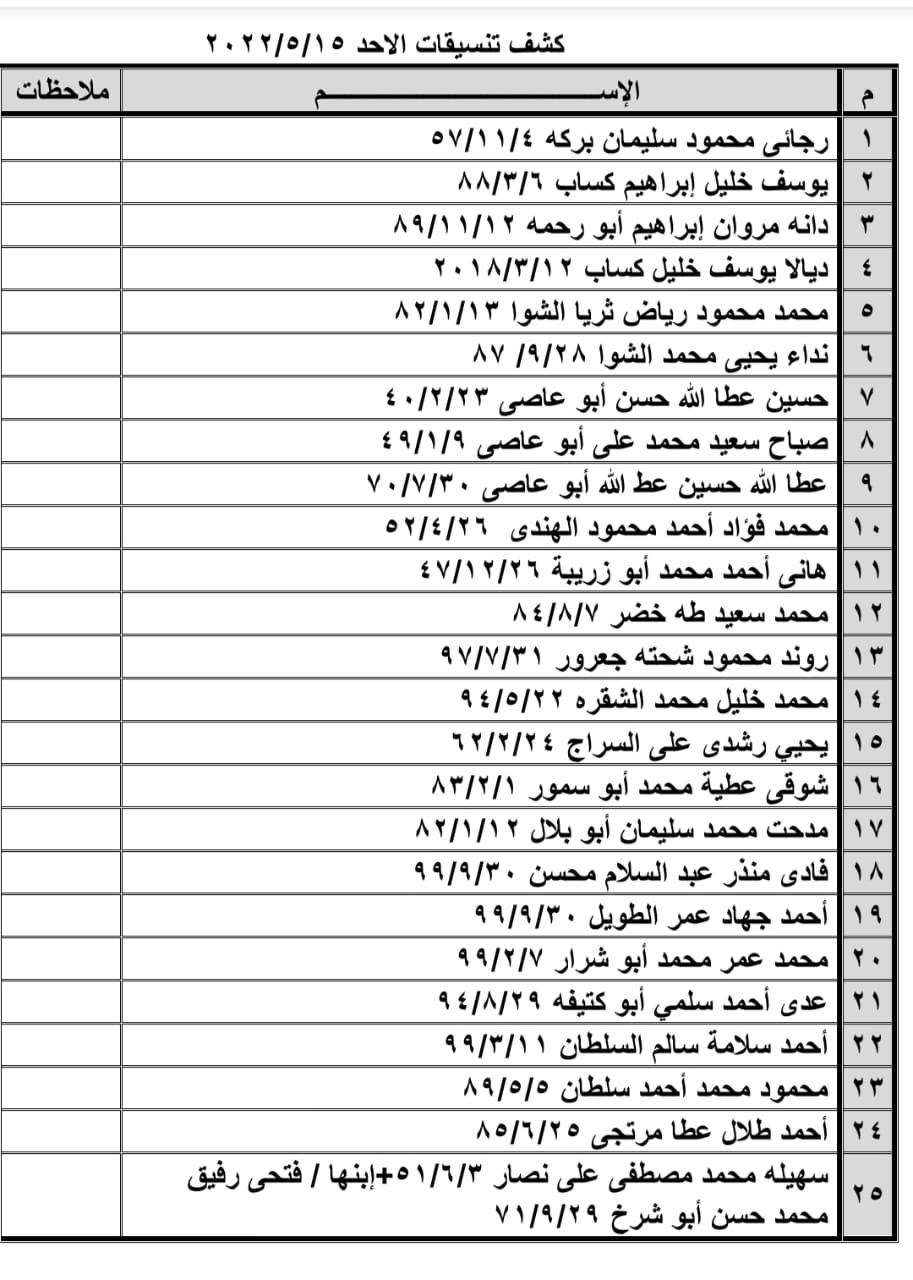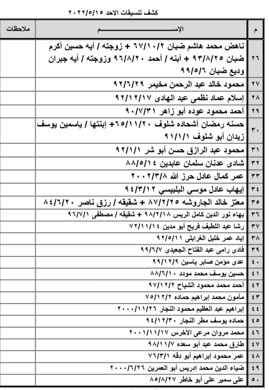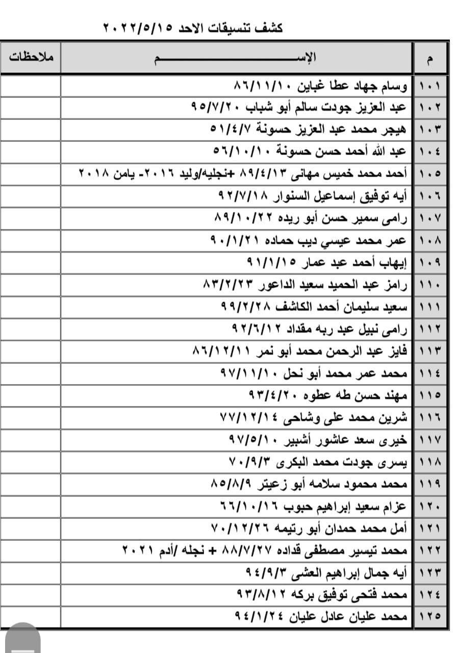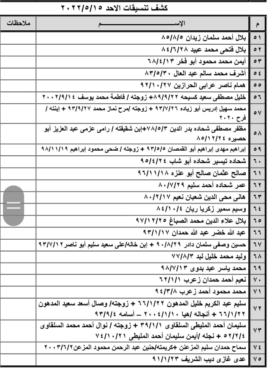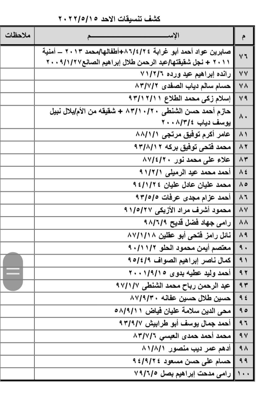 تعلن الهيئة العامة للمعابر والحدود بوزارة الداخلية والأمن الوطني عن وصول كشف "تنسيقات مصرية" للسفر عبر معبر رفح البري يوم الأحد (15 مايو)، والذين عليهم التوجه لإجراء فحص كورونا الساعة 8 صباح الأحد بمركز شـ.ـهداء رفح الصحي ثم التوجه للصالة الخارجية للمعبر لتسهيل سفرهم.