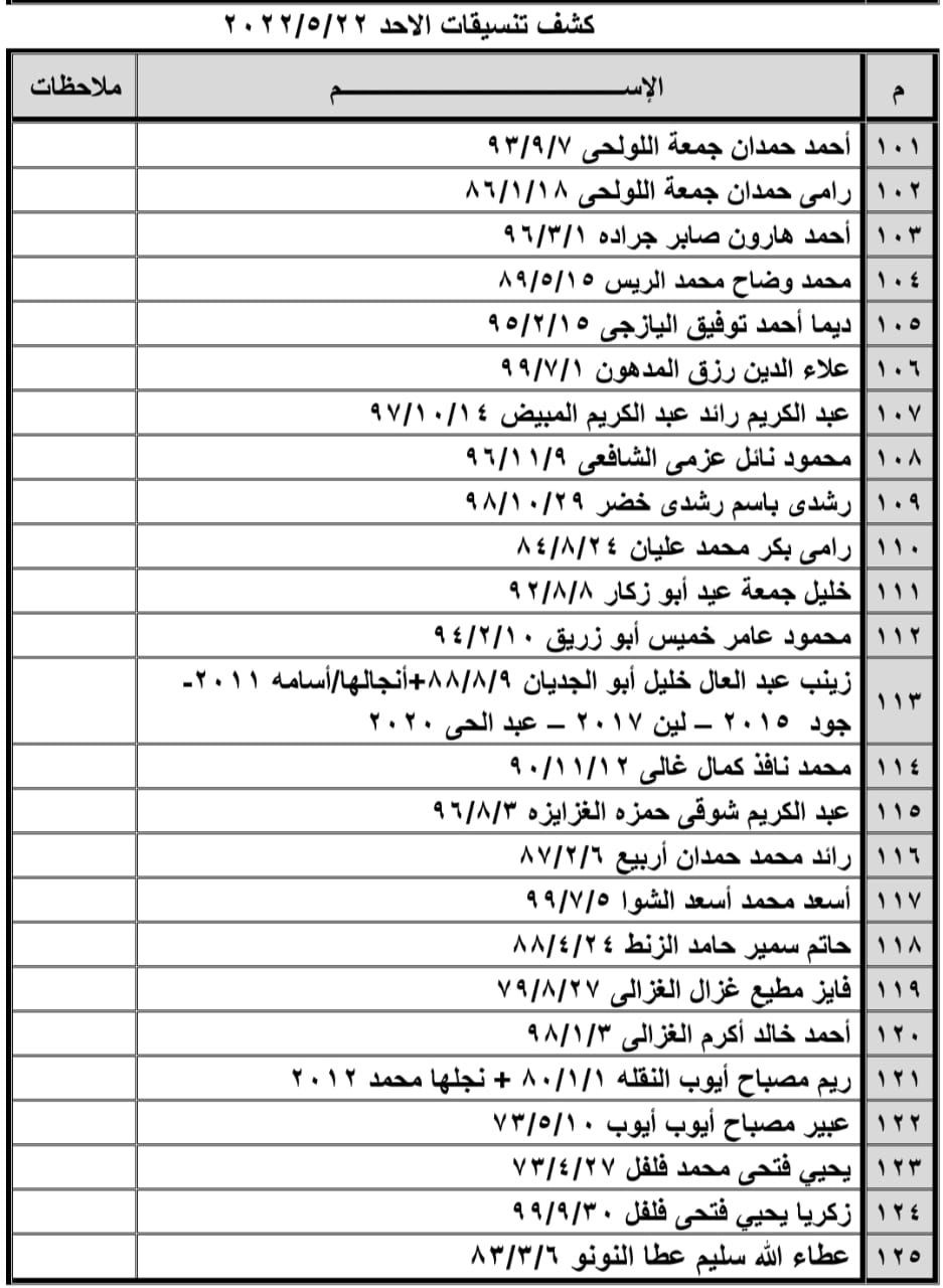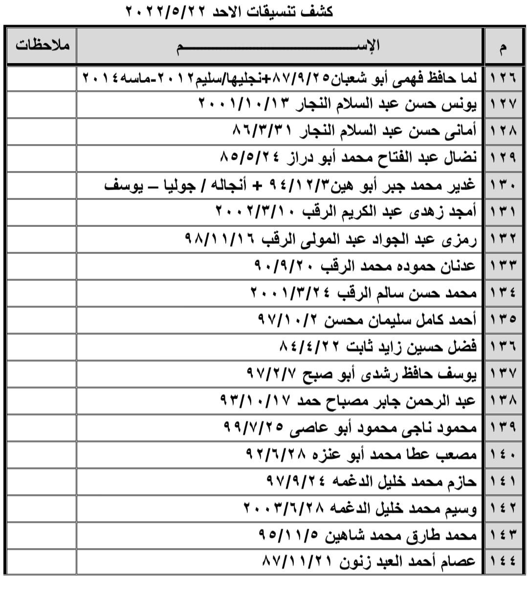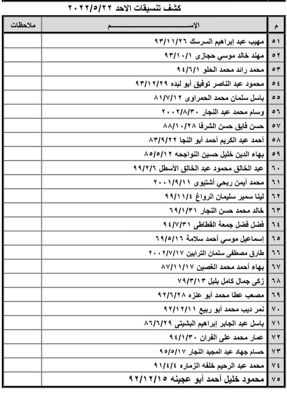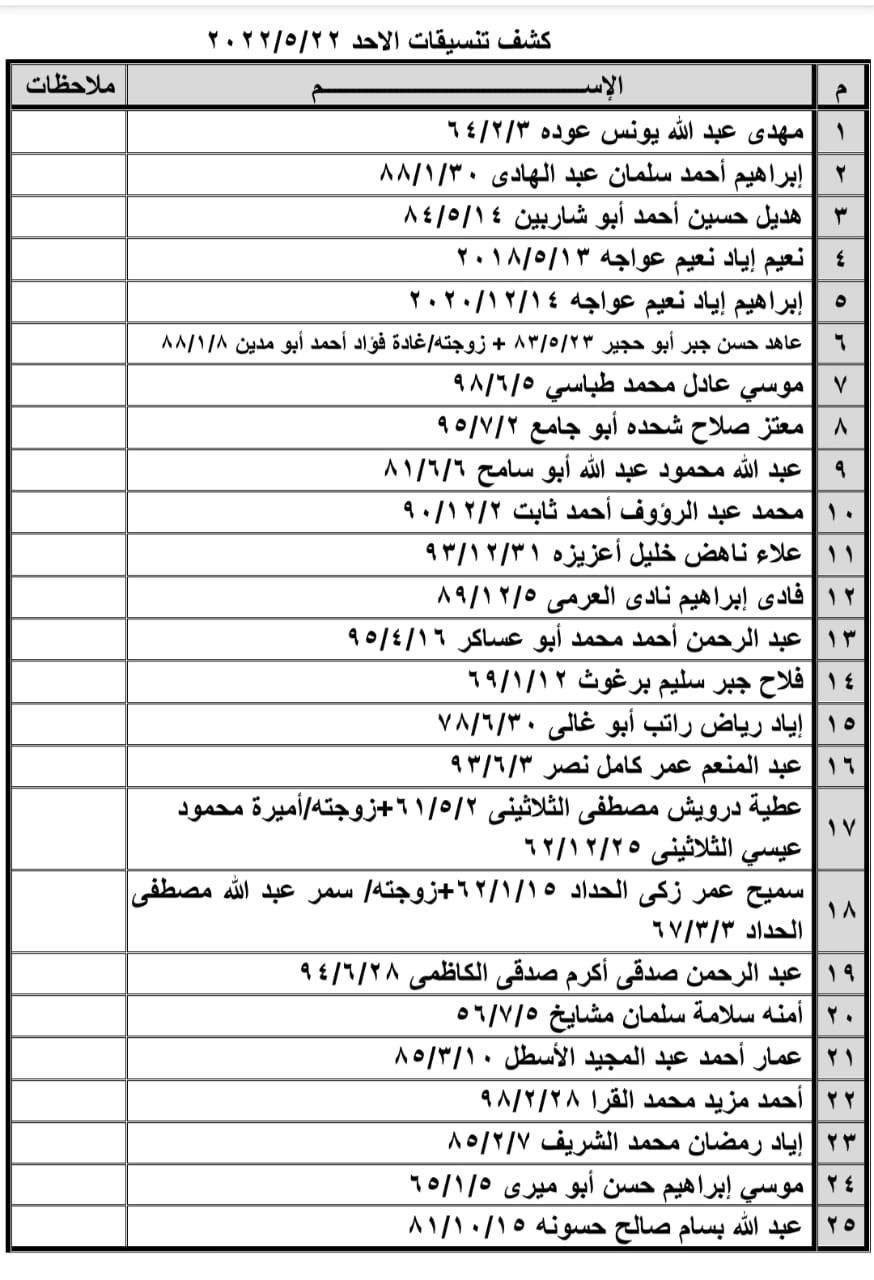 تعلن الهيئة العامة للمعابر والحدود بوزارة الداخلية والأمن الوطني عن وصول كشف "تنسيقات مصرية" للسفر عبر معبر رفح البري يوم الأحد (22 مايو)، والذين عليهم التوجه لإجراء فحص كورونا الساعة 8 صباح الأحد بمركز شــهداء رفح الصحي ثم التوجه للصالة الخارجية للمعبر لتسهيل سفرهم.
