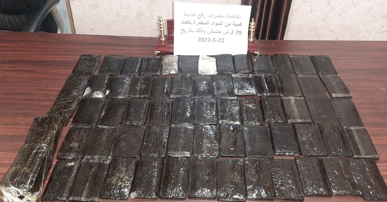 ضبطت شرطة مكافحة المخدرات بمحافظة رفح جنوب غزة، أمس الأحد، 78 فرش حشيش خلال مهمة تفتيشية بالمحافظة.