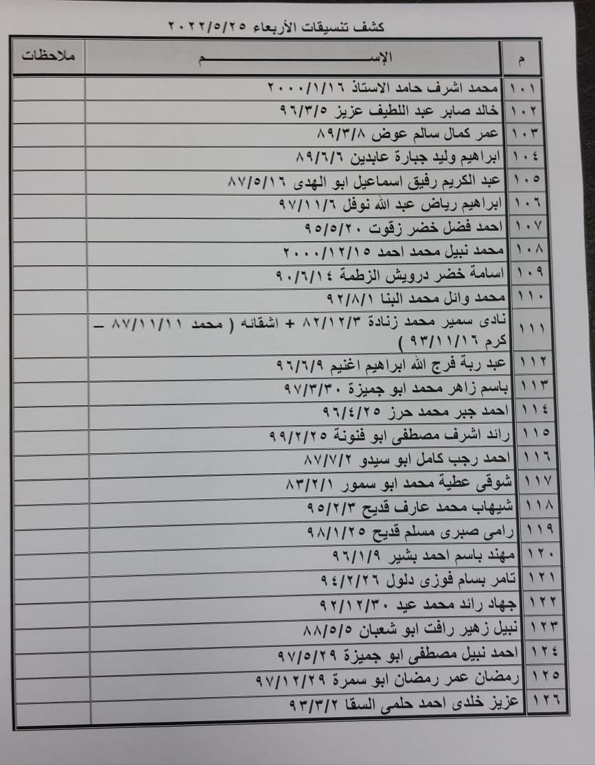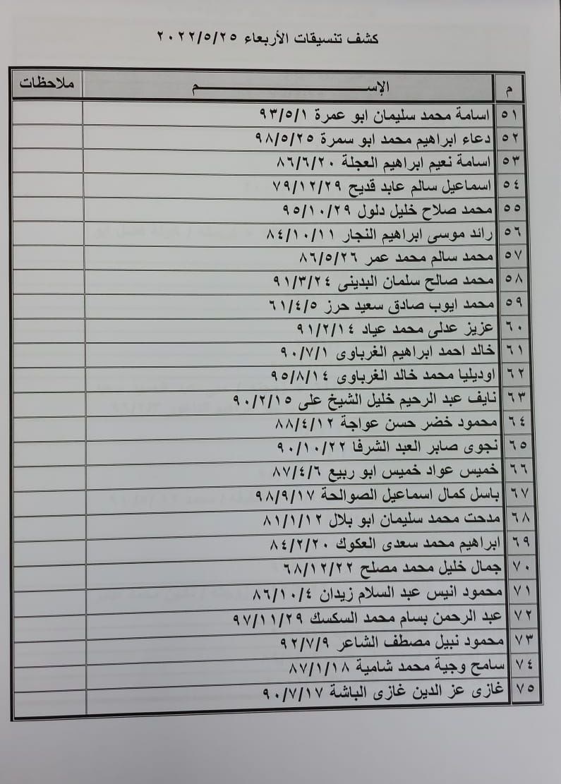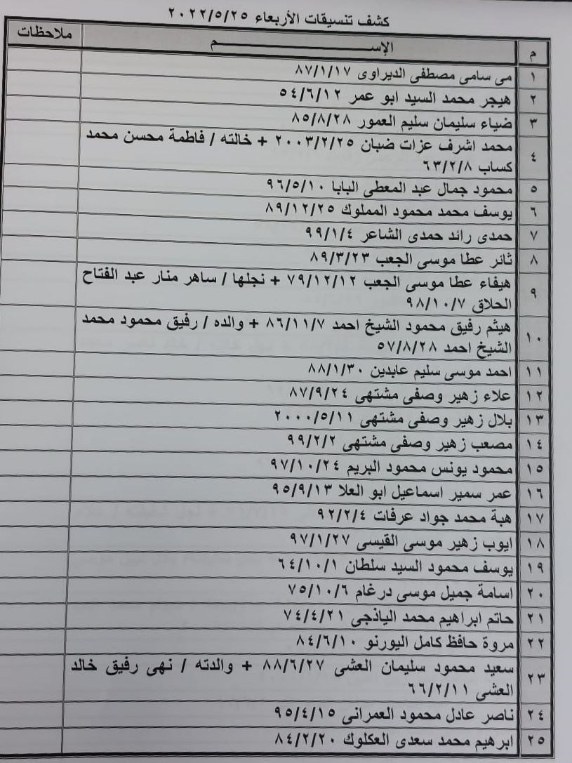 تعلن الهيئة العامة للمعابر والحدود بوزارة الداخلية والأمن الوطني عن وصول كشف "تنسيقات مصرية" للسفر عبر معبر رفح البري يوم غد الأربعاء (25 مايو)، والذين عليهم التوجه لإجراء فحص كورونا بدءاً من الساعة 9 صباح اليوم الثلاثاء في المراكز الصحية المعلن عنها مسبقاً بجميع المحافظات.
