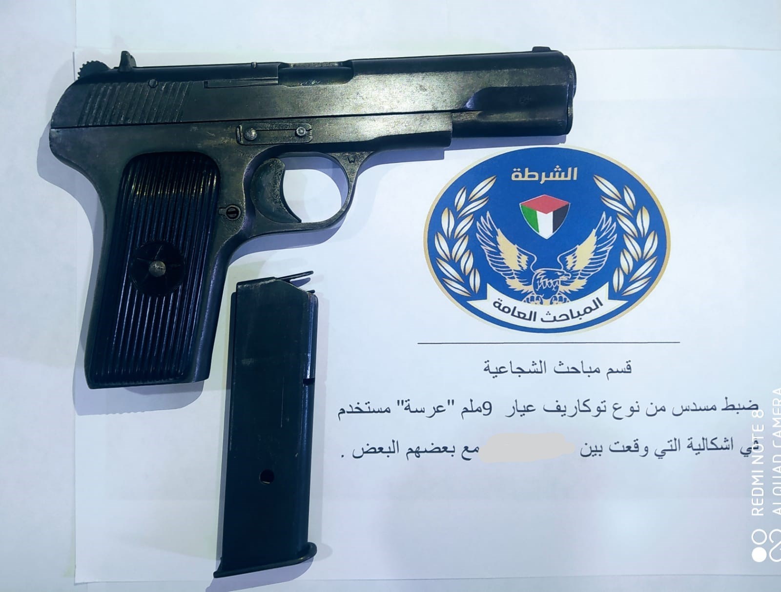 ضبطت مباحث غزة قسم الشجاعية، سلاحاً نارياً من نوع مسدس " توكاريف عيار 9 ملم"، اُستخدم في شجار عائلي بمنطقة الشجاعية.