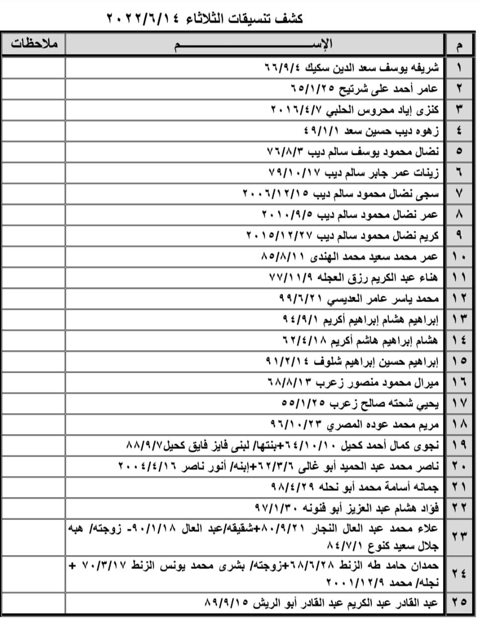 تعلن الهيئة العامة للمعابر والحدود بوزارة الداخلية والأمن الوطني عن وصول كشف "تنسيقات مصرية" للسفر عبر معبر رفح البري يوم الثلاثاء (14 يونيو)، والذين عليهم التوجه لإجراء فحص كورونا بدءاً من الساعة 9 صباح الإثنين في المراكز الصحية المعلن عنها مسبقاً بجميع المحافظات.