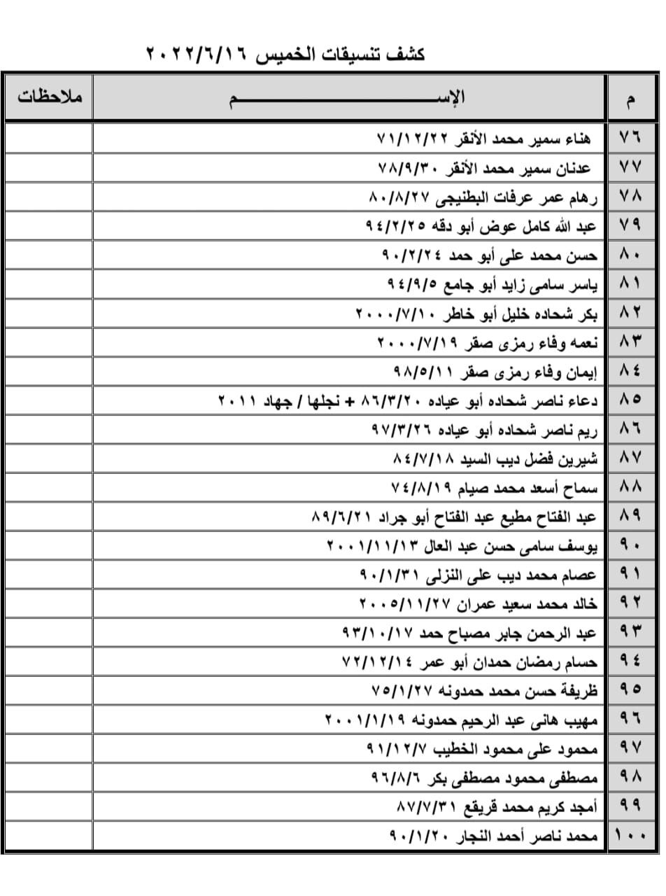 تعلن الهيئة العامة للمعابر والحدود بوزارة الداخلية والأمن الوطني عن وصول كشف "تنسيقات مصرية" للسفر عبر معبر رفح البري يوم غد الخميس (16 يونيو)، والذين عليهم التوجه لإجراء فحص كورونا بدءاً من الساعة 9 صباح اليوم في المراكز الصحية المعلن عنها مسبقاً بجميع المحافظات.