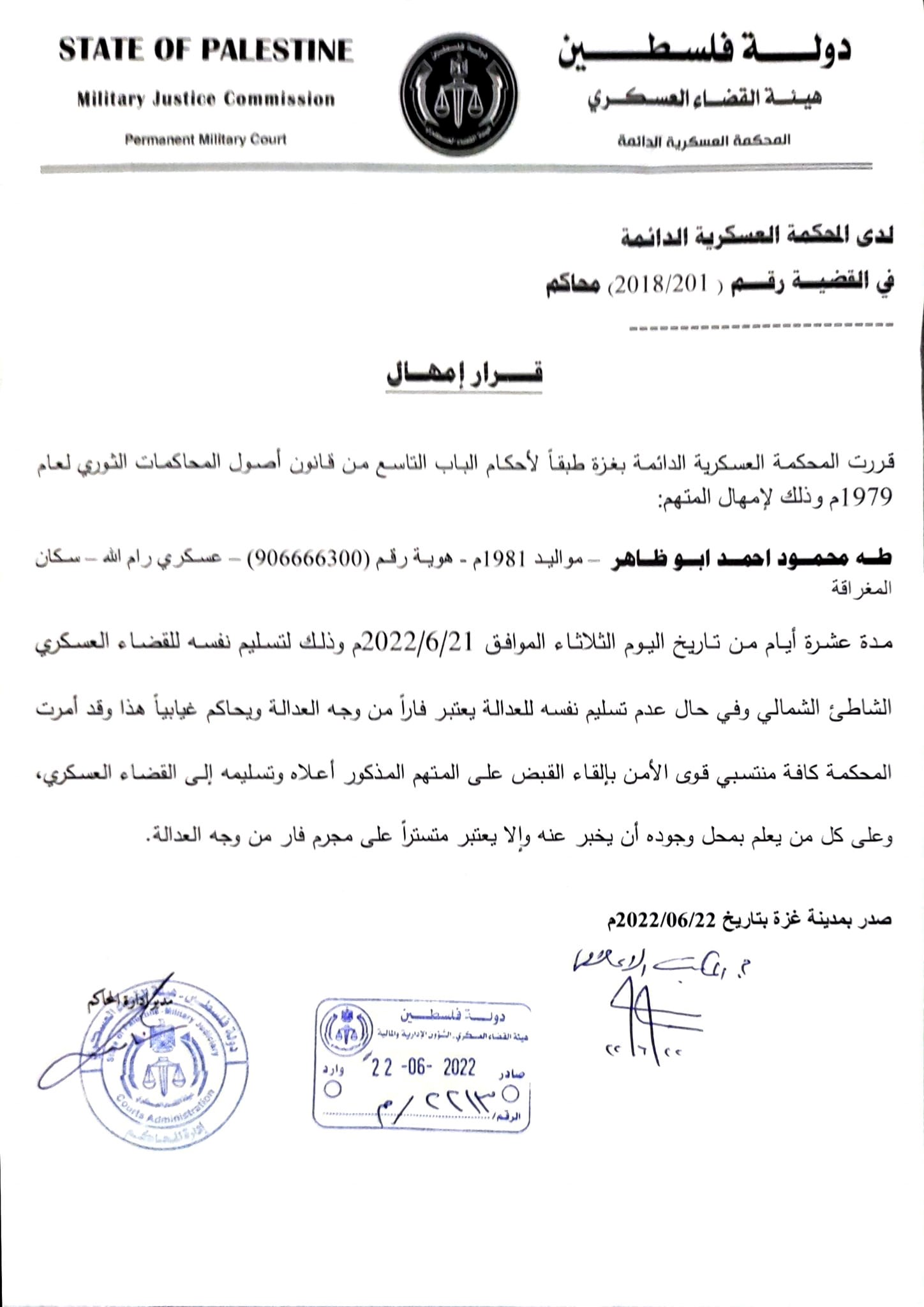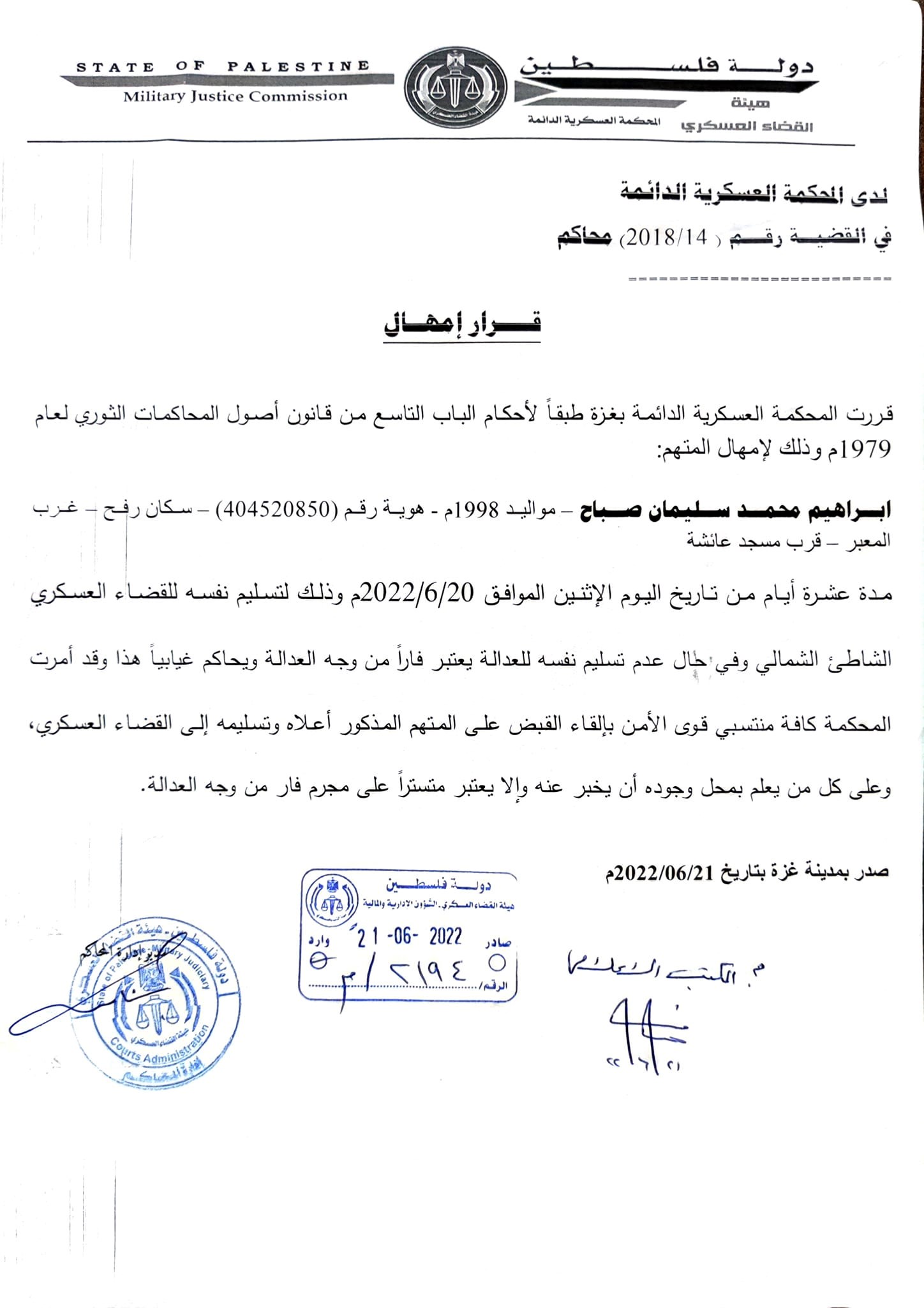 وكانت المحكمة العسكرية أمهلت المتهم أبو ظاهر عشرة أيام من تاريخ يوم الثلاثاء الموافق 21/06/2022م، فيما أمهلت المتهم صبَّاح عشرة أيام من تاريخ يوم الإثنين الموافق 20/06/2022م، لتسليم نفسيهما للقضاء العسكري.