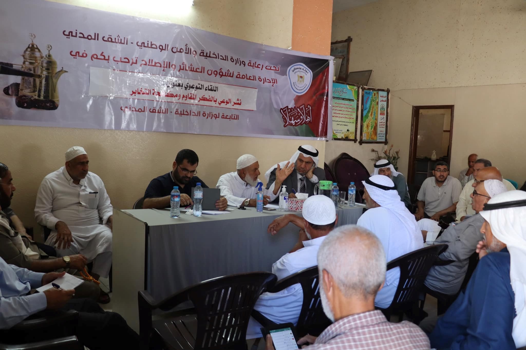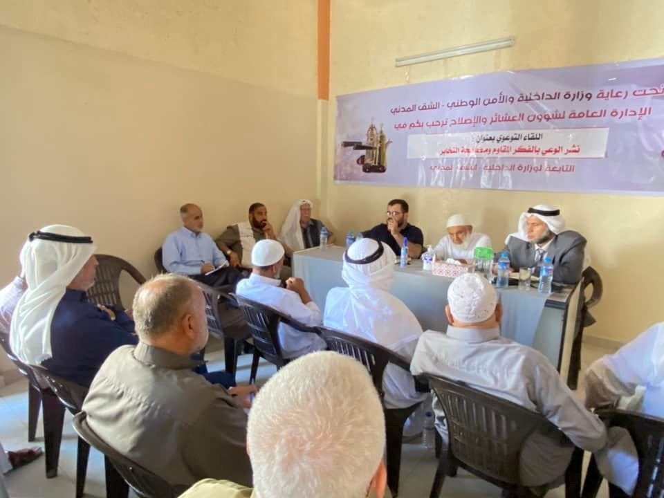 نظمت الإدارة العامة لشؤون العشائر والإصلاح بوزارة الداخلية ممثلةً بمديرها العام المستشار د. علاء الدين العكلوك، لقاءً توعويًا بعنوان "نشر الوعي بالفكر المقاوم ومكافحة التخابر" وذلك بالتنسيق والتعاون مع أ. جمال الكحلوت مدير مكتب عشائر محافظة الشمال.