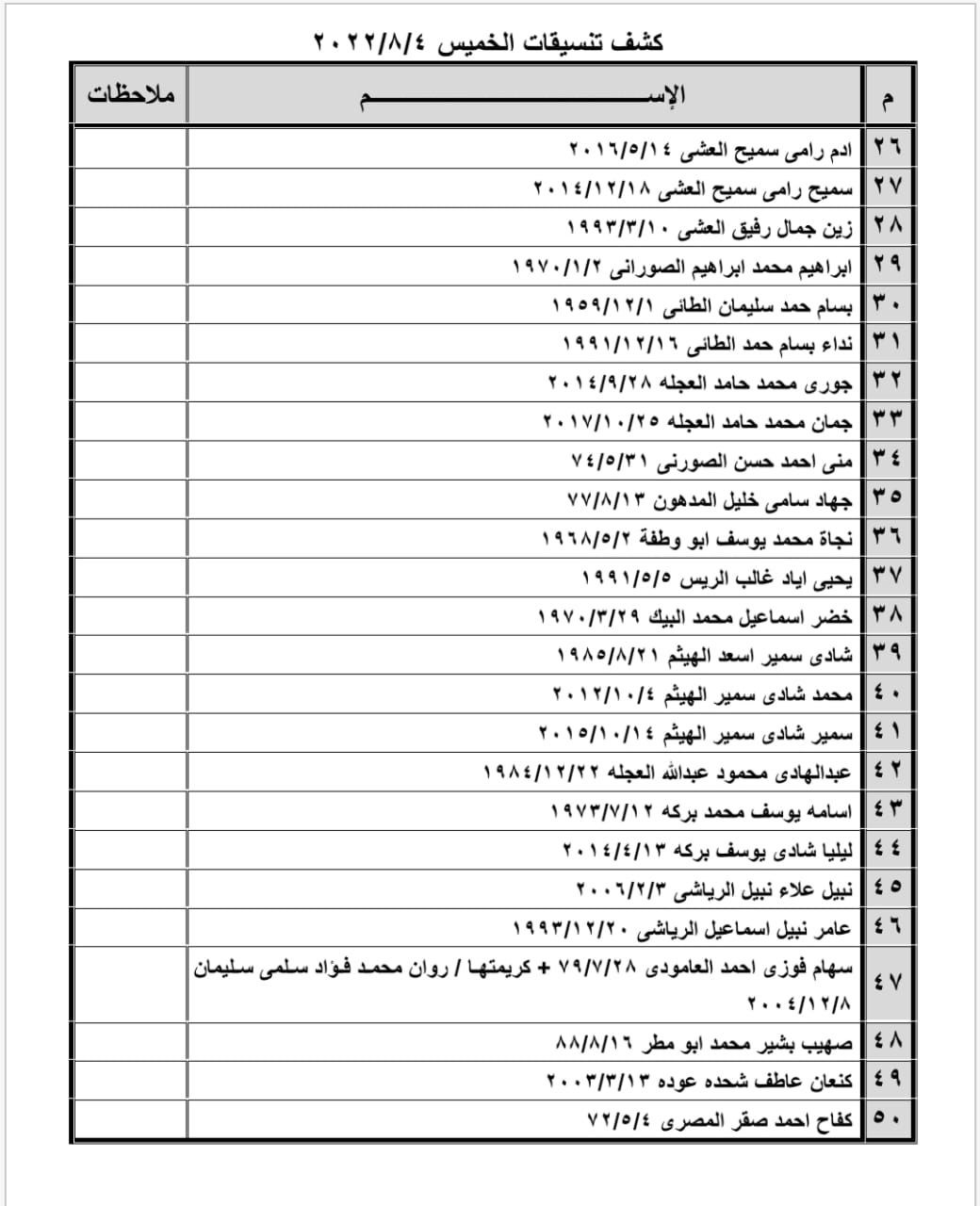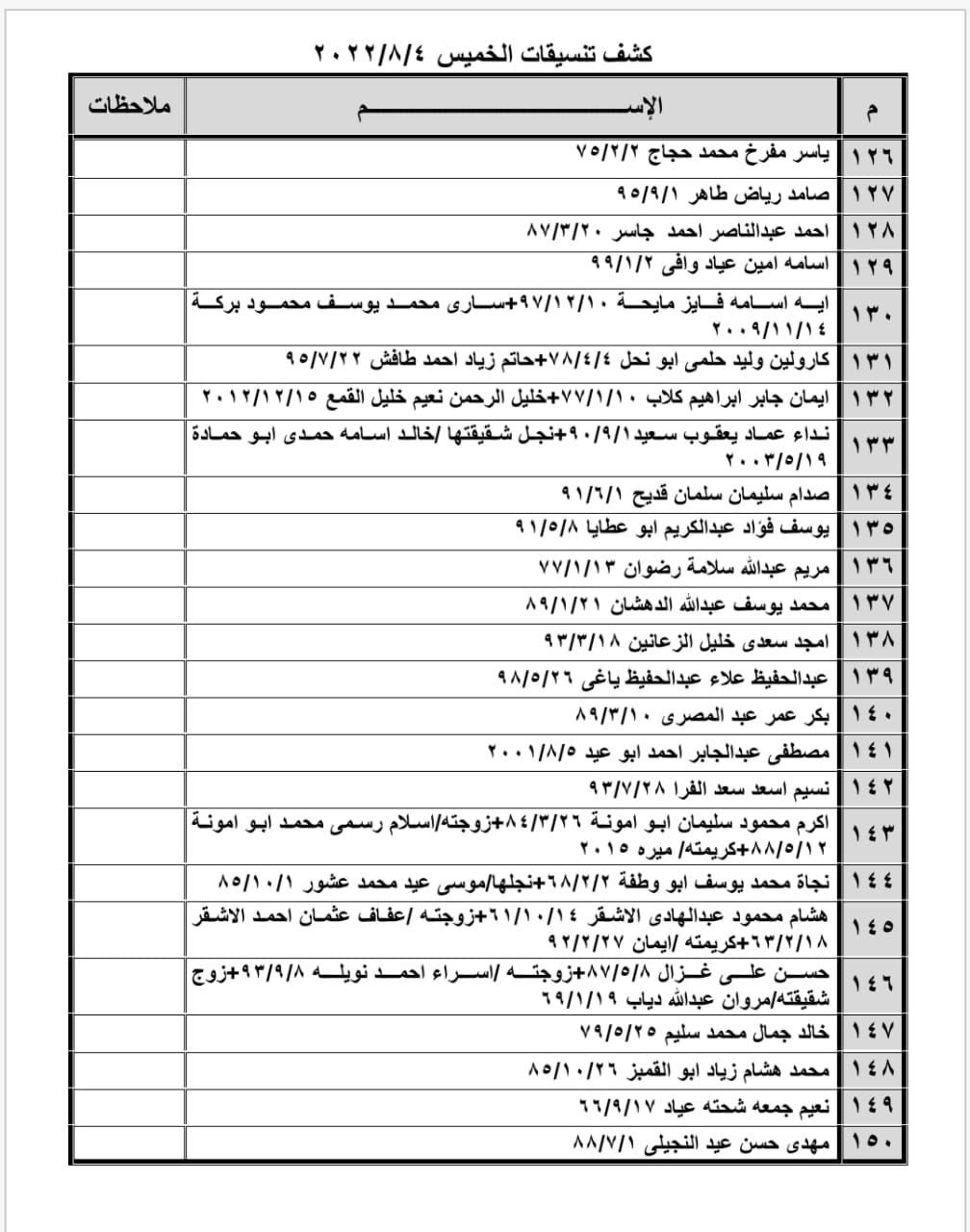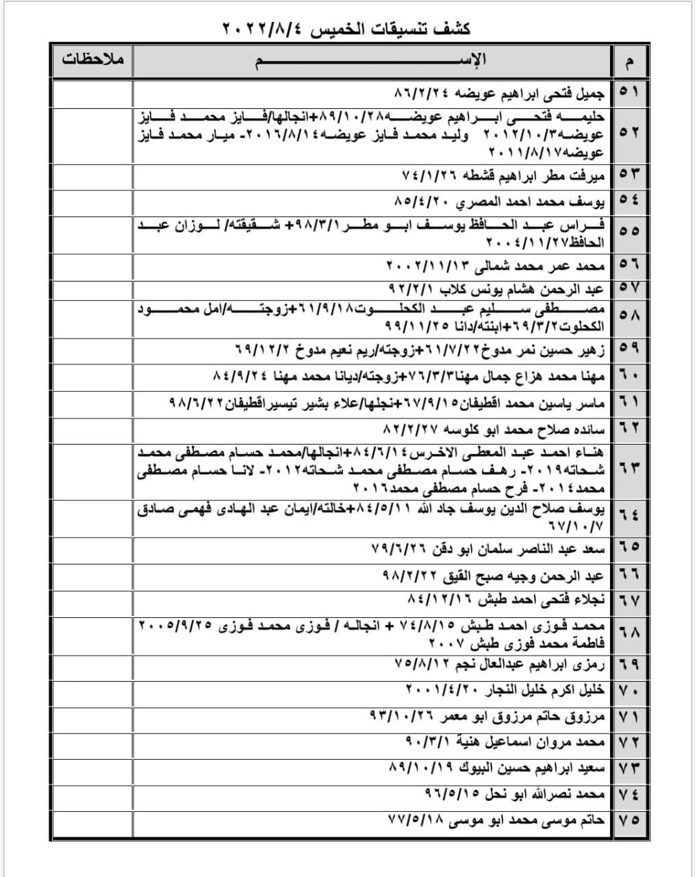 تعلن الهيئة العامة للمعابر والحدود بوزارة الداخلية والأمن الوطني عن وصول كشف "تنسيقات مصرية" للسفر عبر معبر رفح البري يوم غد الخميس (4 أغسطس)، والذين عليهم التواجد س 8:00 صباحاً في الصالة الخارجية للمعبر لتسهيل سفرهم.